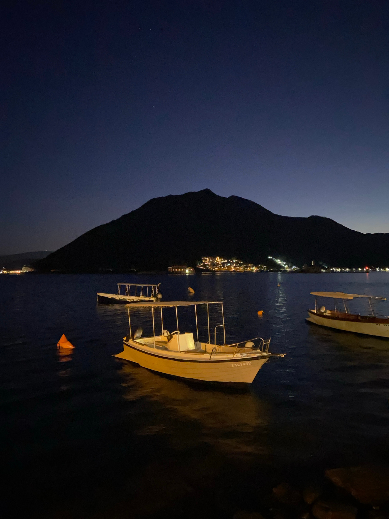 The image depicts a night scene in Perast, Montenegro, showcasing several boats docked in the bay. The dark silhouette of a mountain rises in the background, contrasting with the dim lights of the tow…read more