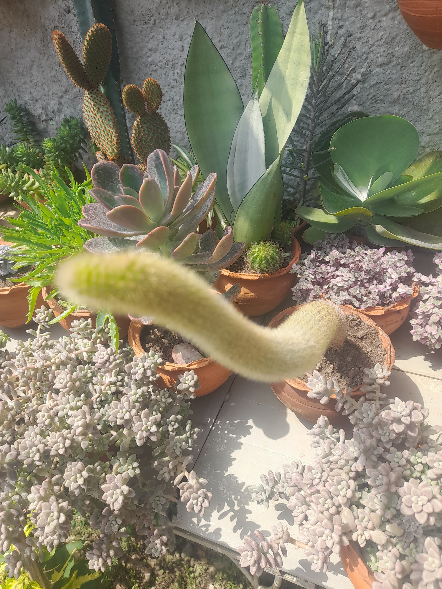 The image shows a collection of potted succulent plants arranged on a surface in Tinaquillo, Venezuela. The plants include a golden barrel cactus, paddle plant (Kalanchoe thyrsiflora), sansevieria, op…read more