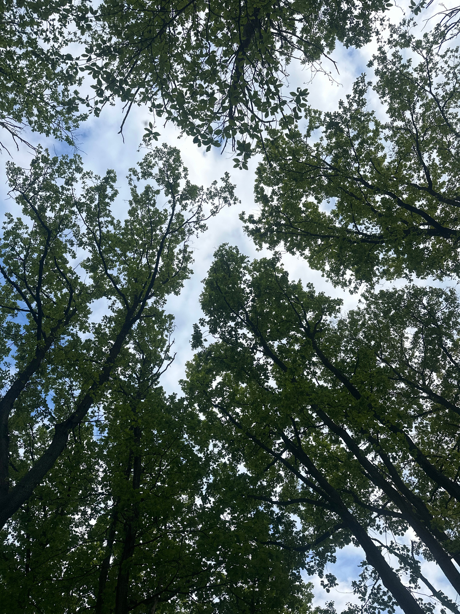 The image is taken from a low angle, looking upward through a canopy of trees toward a sky with patchy clouds. The branches and leaves fill much of the frame, with the sky visible in the gaps between…read more