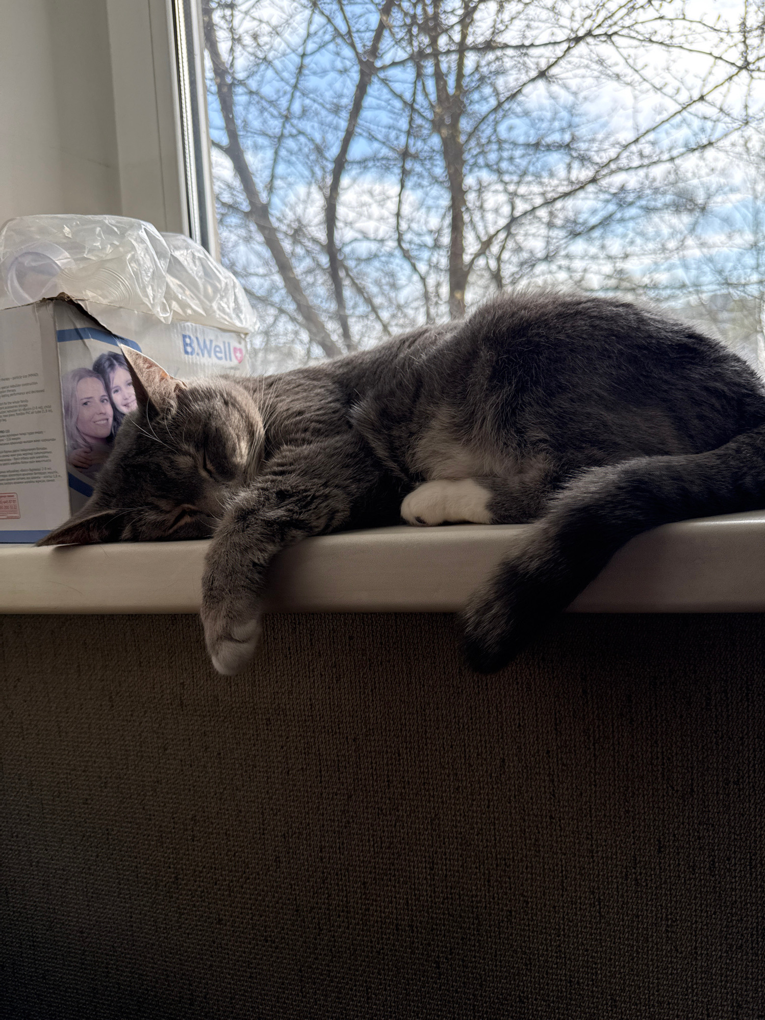 A gray and white cat is resting on a windowsill in front of a window. The cat is lying on a box. A barren tree is visible through the window, with a blue sky in the background. A brown curtain is visi…read more
