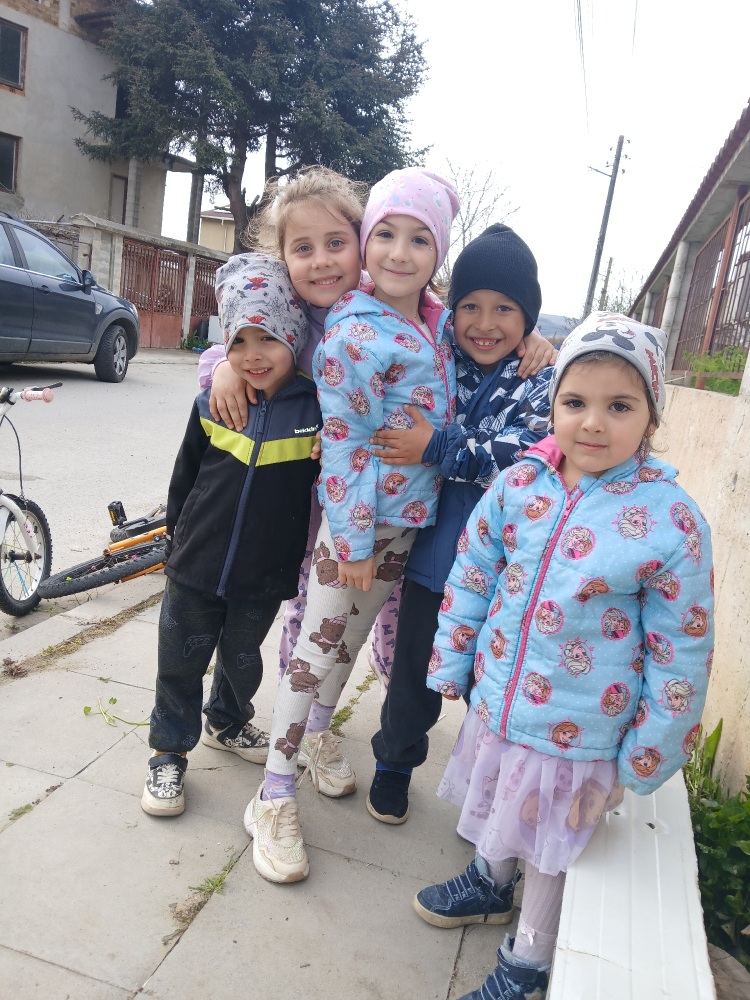The image shows a group of five children stacked on top of each other in a vertical line, facing the camera. The children appear to be of varying ages, and are wearing different clothing styles. The fâŚread more