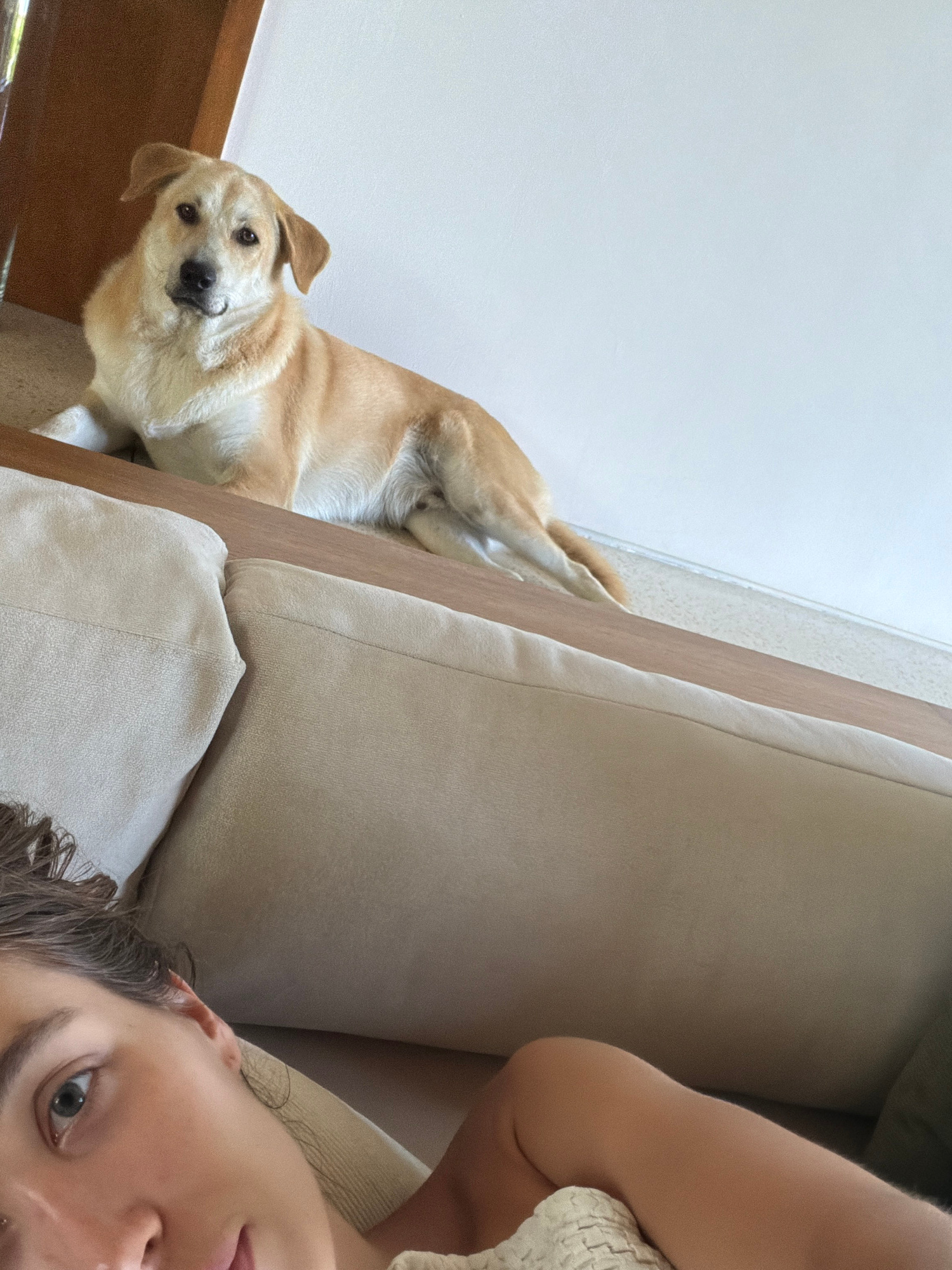 A medium-shot, canted-angle view features a fair-skinned person in the lower right and a tan-colored dog on the left. The person's face, with short, dark, curly hair, and one visible blue eye, is angl…read more
