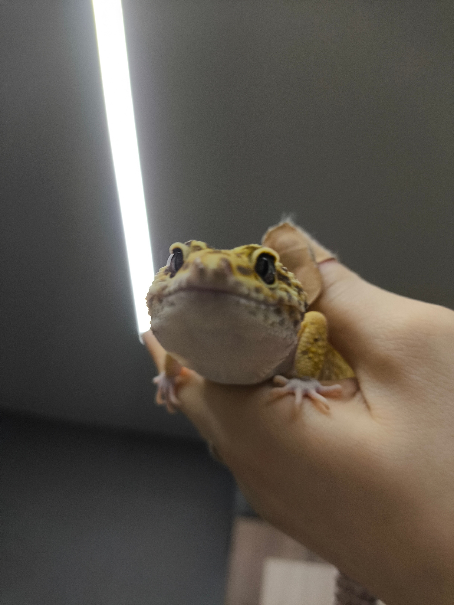 A person is holding a yellow leopard gecko in their hand. The gecko is facing the camera and its head is in focus. The person's hand is lightly colored, and only a portion of the arm is visible. The b…read more