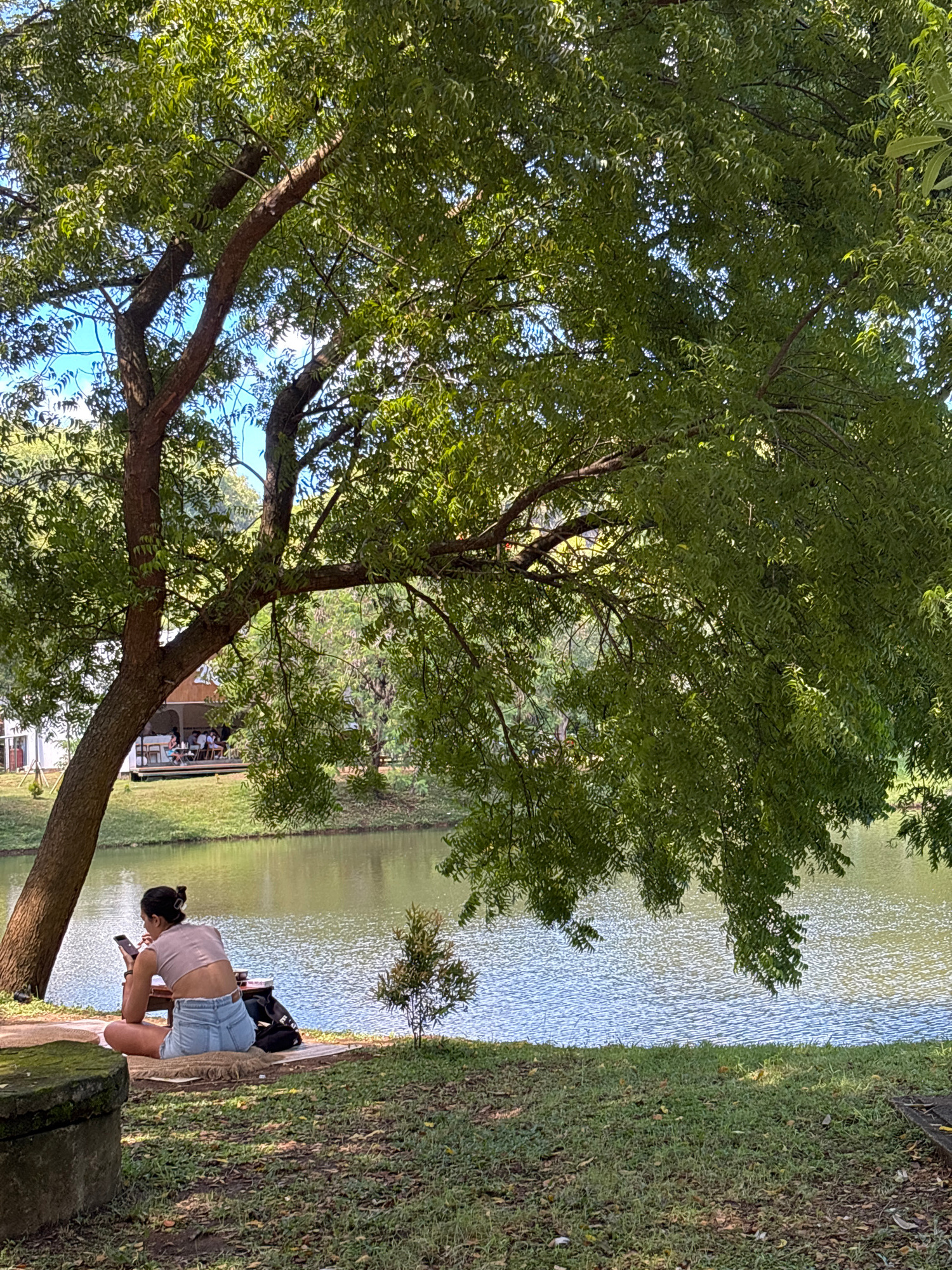 The image displays an outdoor scene by a body of water, likely a lake or large pond, under a bright, sunny sky. A large tree with dense green foliage and sturdy brown branches dominates the left sideβ¦read more