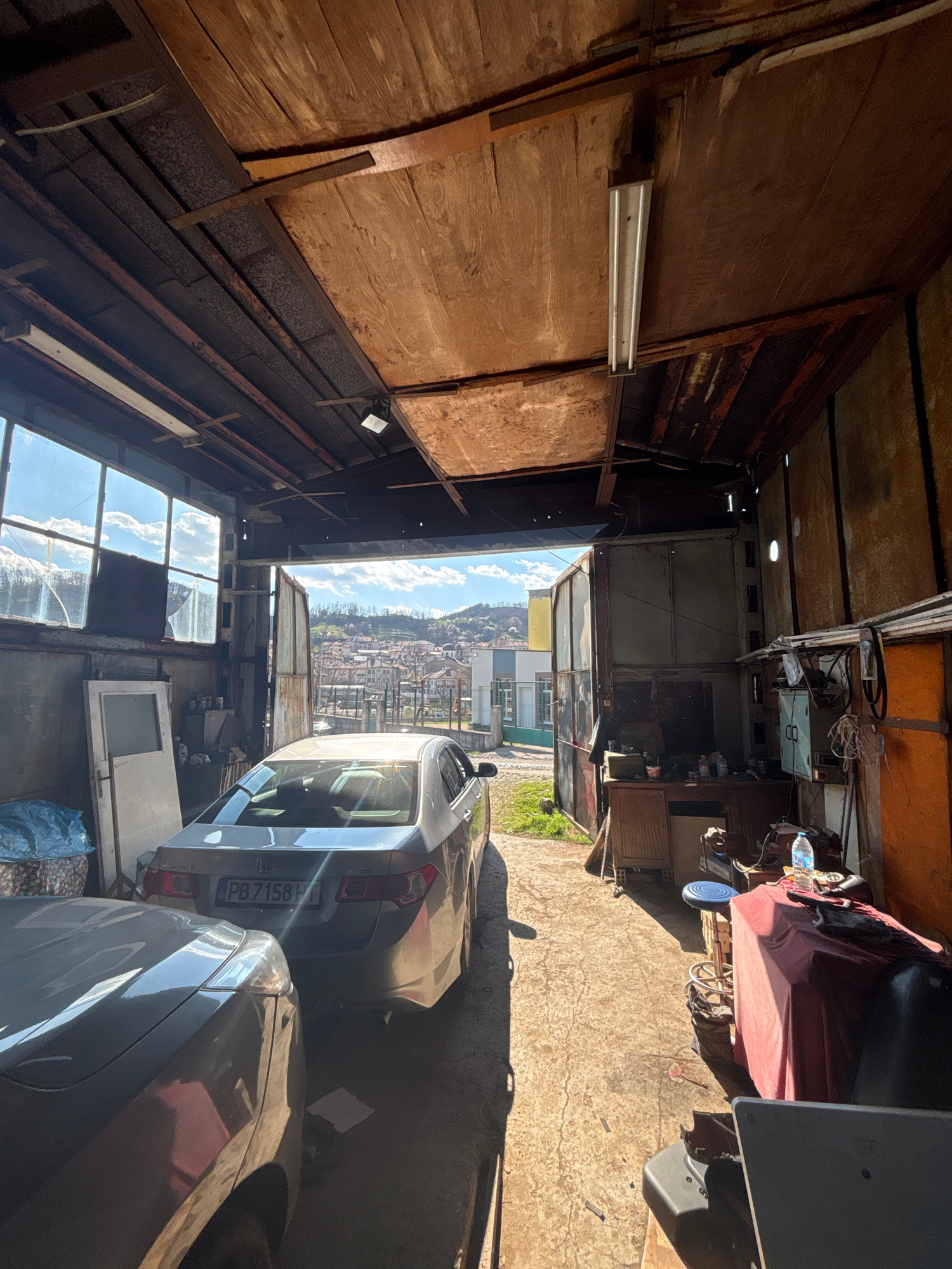 The image presents an interior view of a cluttered garage in Zlatograd, Bulgaria, looking out towards the city. The garage is constructed from wood and metal, showing signs of age and disrepair. Sever…read more