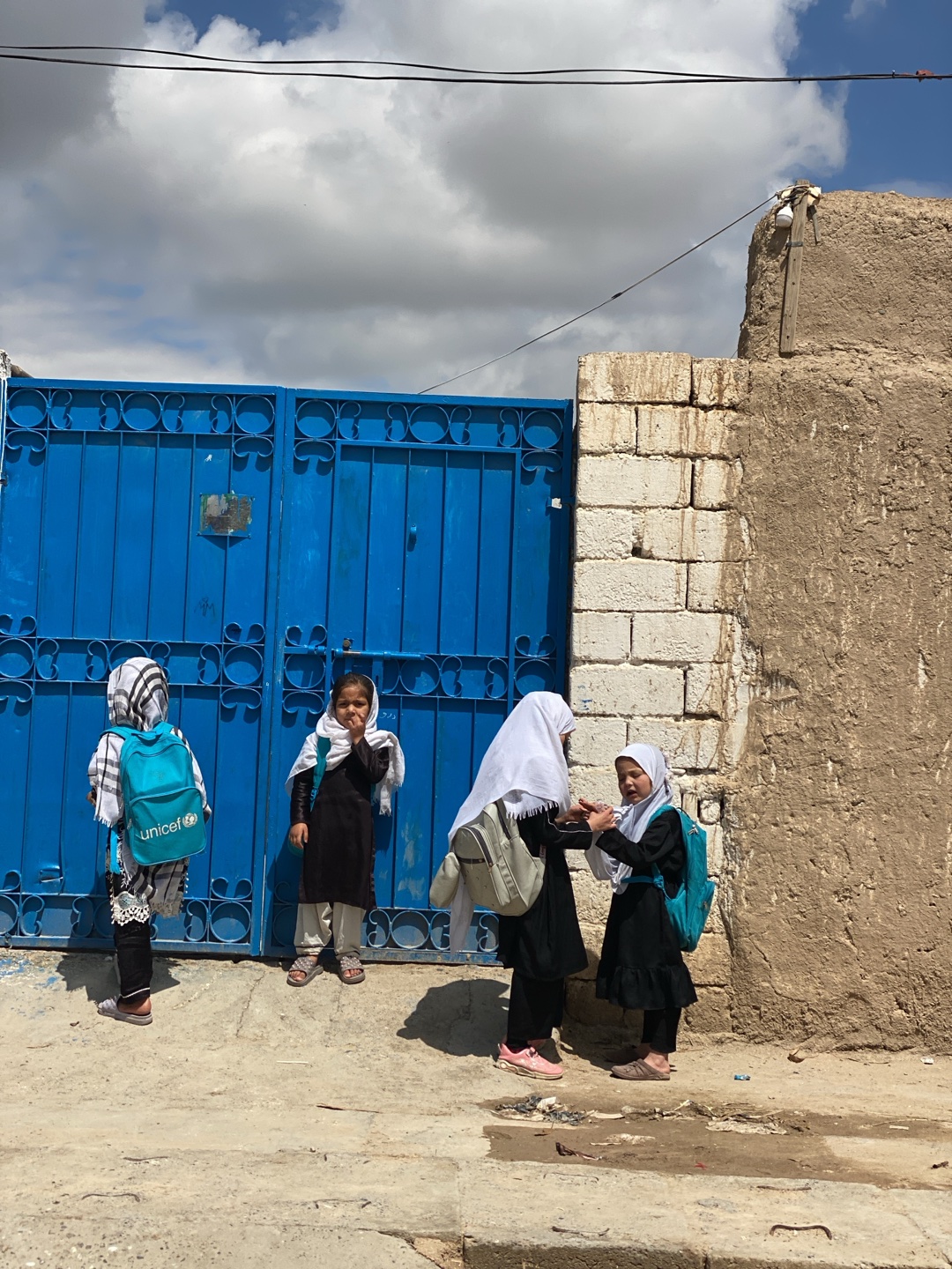 Four young girls are standing on a paved area in front of a blue metal gate and a rough-textured, light-colored building wall. Two of the girls are wearing black dresses, white headscarves, and carryi…read more