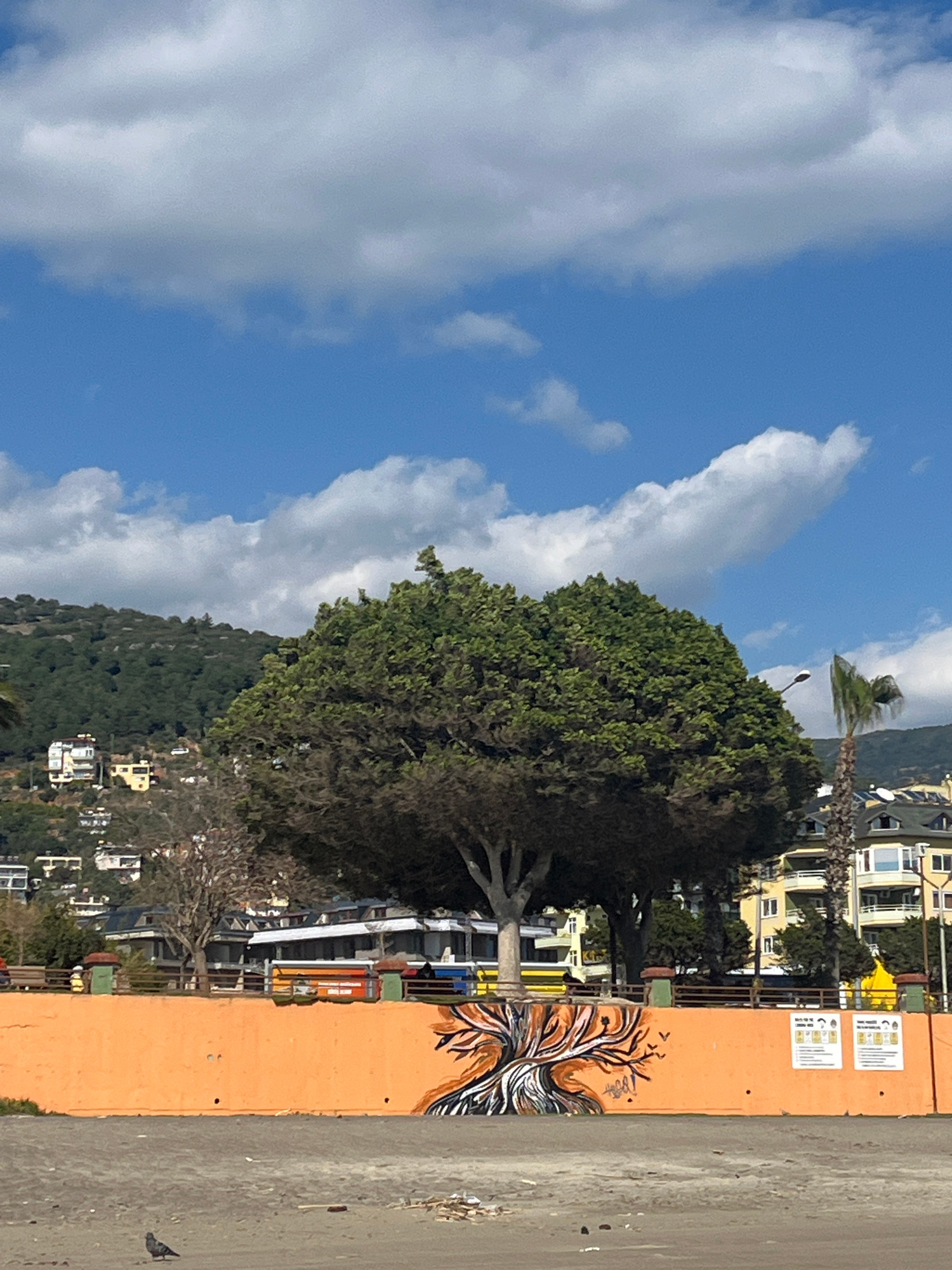 A landscape image taken in Alanya, Turkey, oriented in a vertical format, shows a bright blue sky partially filled with white clouds on the left side. The foreground is dominated by a light orange wal…read more