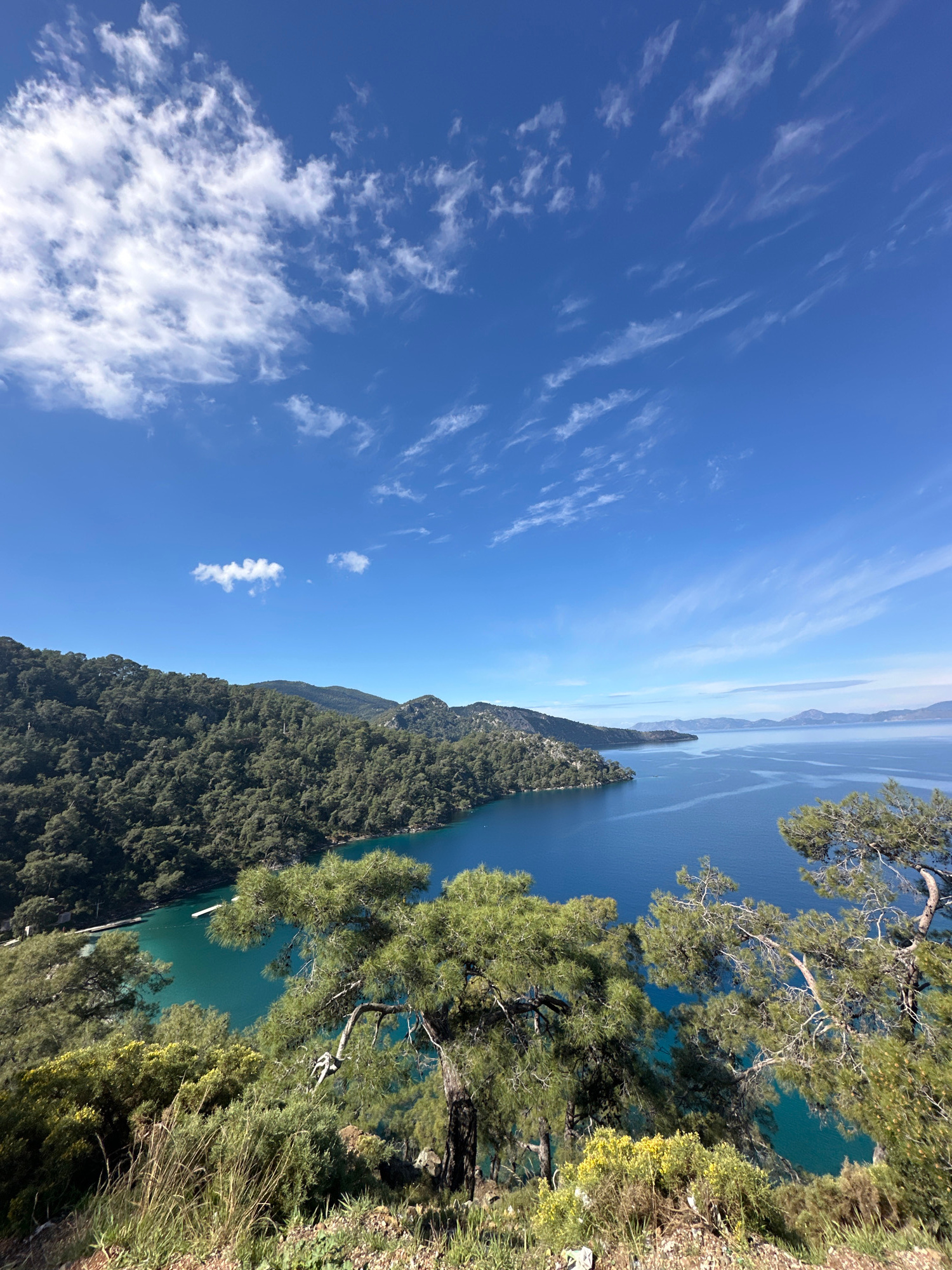 The image depicts a landscape likely situated in Fethiye, Turkey, evidenced by the coastal geography and vegetation. The view is taken from an elevated position, looking out over a body of water with…read more