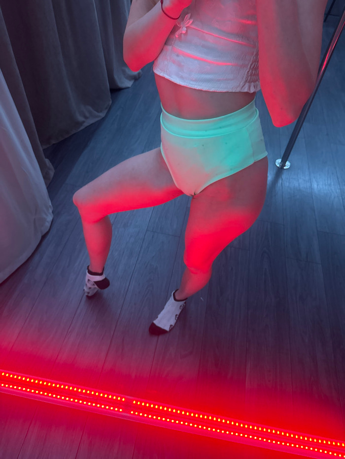 Location: Unknown, Unknown. A partial view of an individual is captured indoors, from the chest to the feet. The person wears a white textured crop top, light blue high-waisted briefs, and white ankl…read more