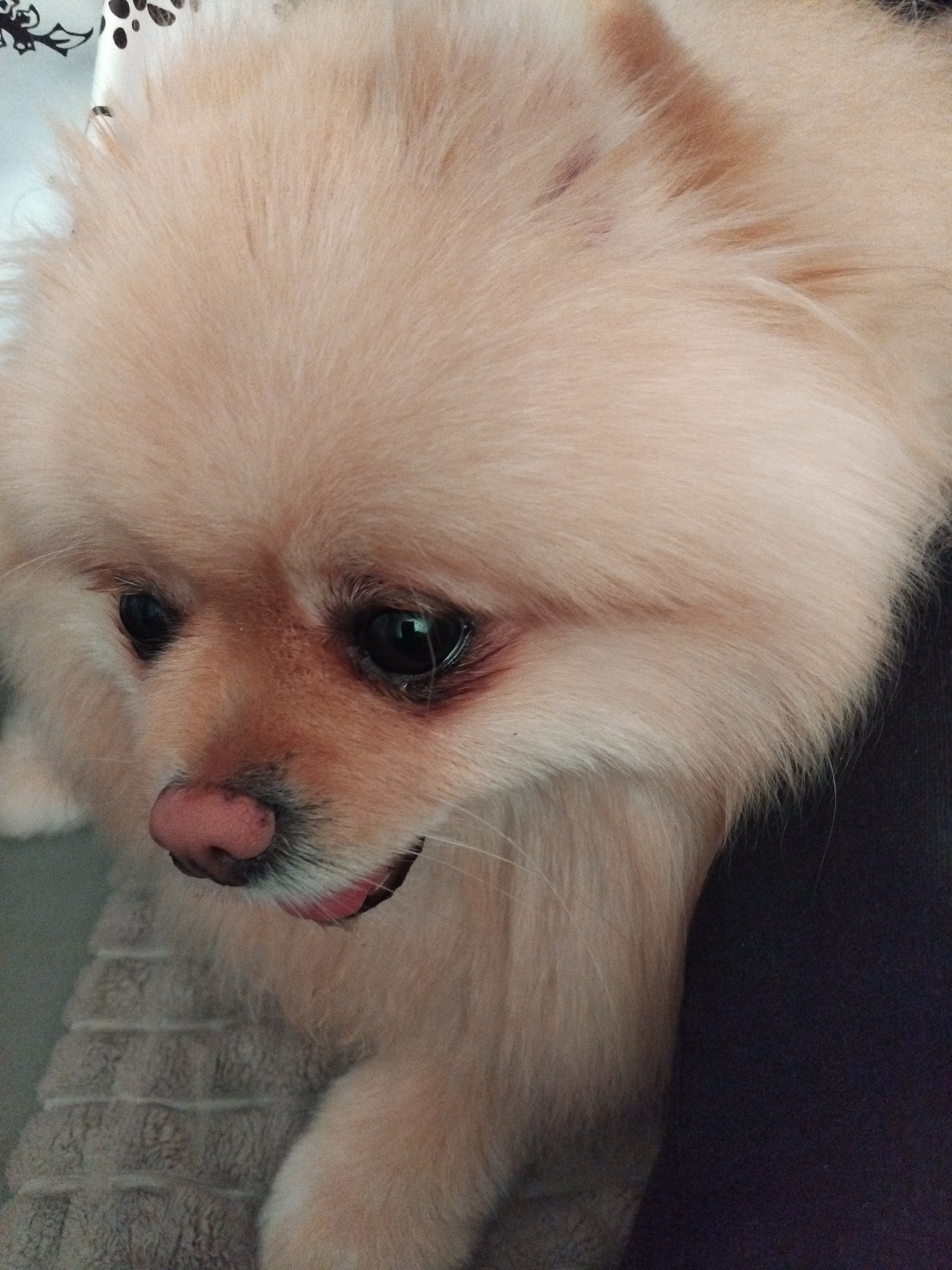 A close-up, indoor shot shows a light beige Pomeranian dog lying down. The dog is facing the camera at an angle, revealing its face and part of its body. The dog has a pink nose, dark eyes, and its to…read more
