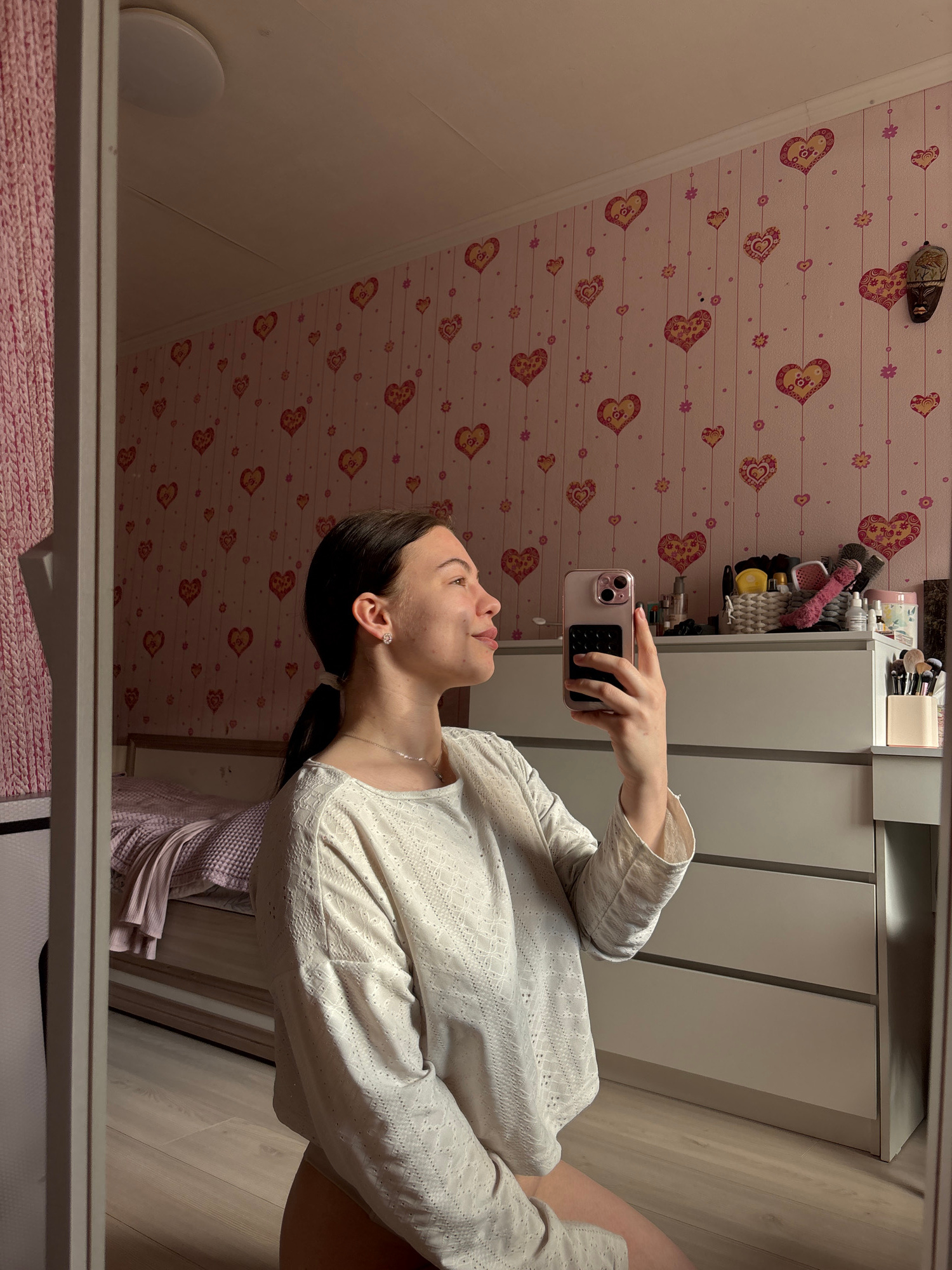 A young woman is taking a selfie in a mirror. She is holding a pink iPhone with a black camera grid. She is wearing a white, textured long-sleeve shirt. Her hair is dark and pulled back in a ponytail.…read more