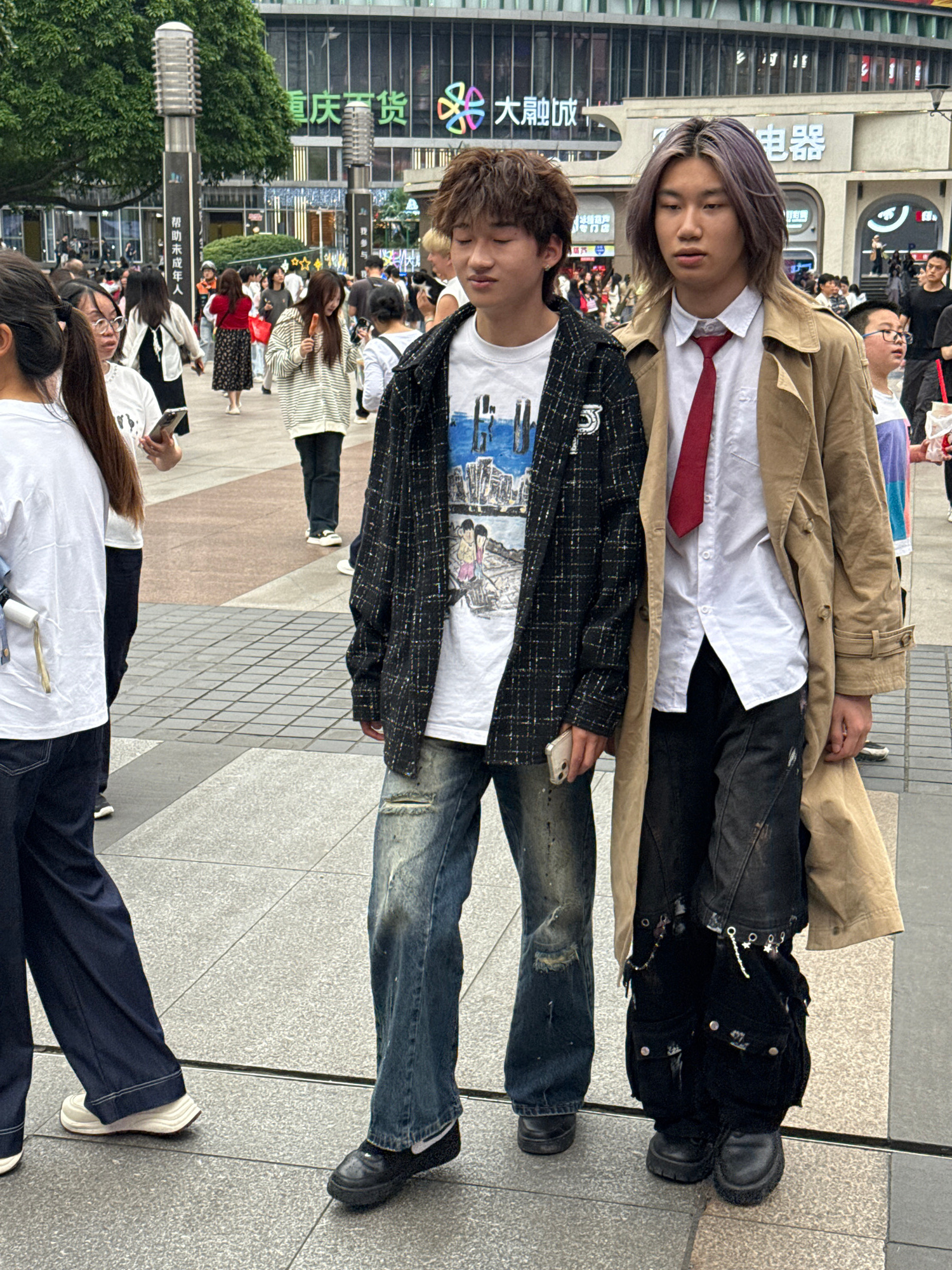 On a public pedestrian plaza in Liangjiang, China, two young individuals stand out amidst a larger group of people. The first, an individual with short brown hair, wears a graphic t-shirt under a dar…read more