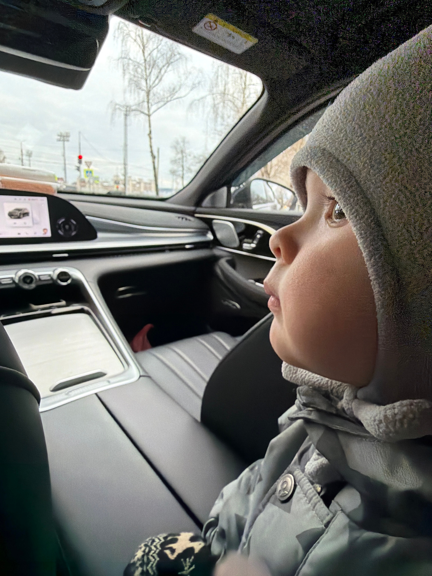 A close-up, Dutch-angle shot captures a young child from the chest up, situated within the interior of a modern car. The child is wearing a grey knitted hat and a grey/blue winter jacket, suggesting c…read more