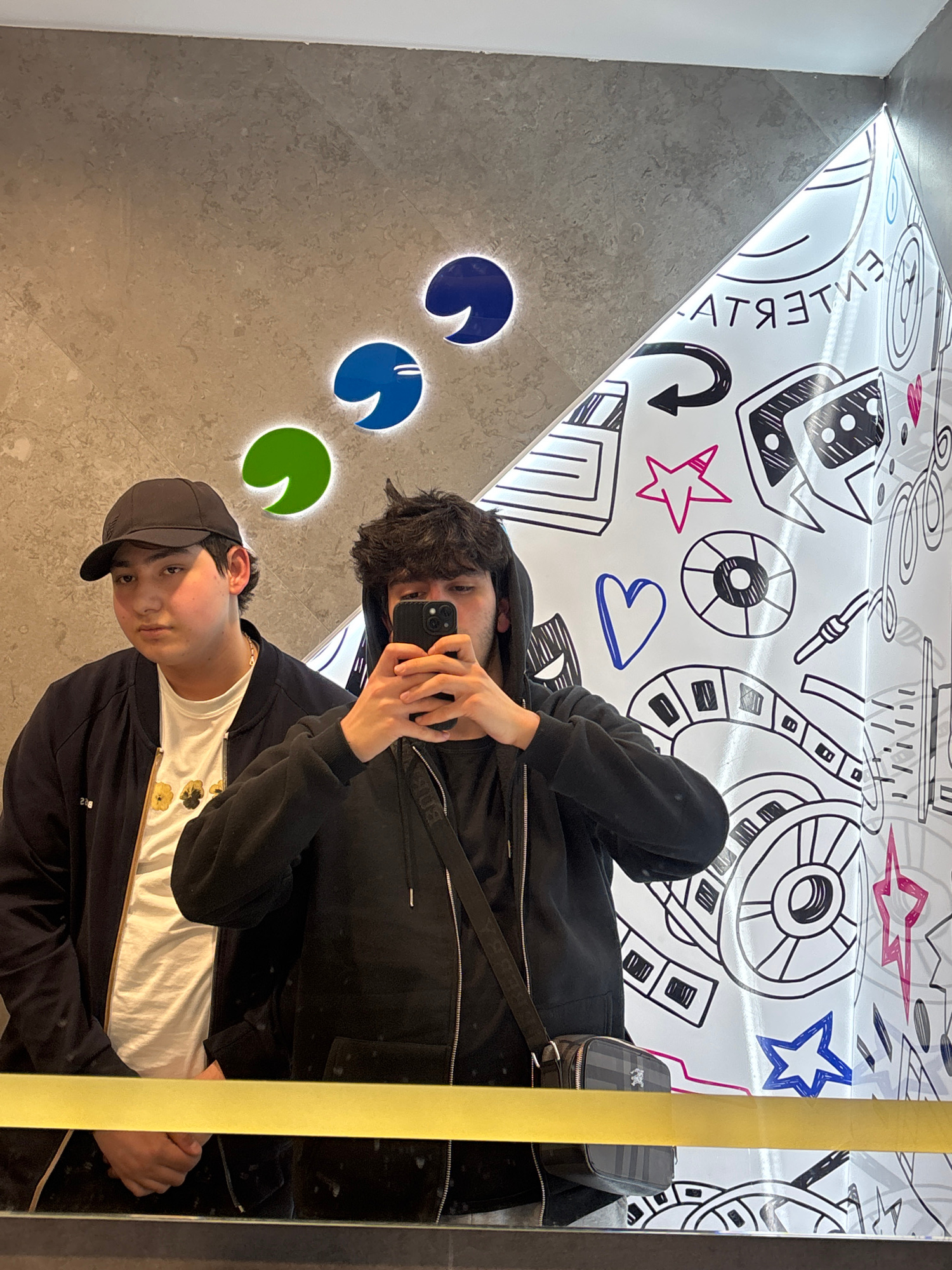 A photograph shows two young men taking a selfie in a mirror within a building in Yerevan, Armenia. The man closest to the camera wears a black baseball cap, a black jacket, and a white T-shirt with a…read more