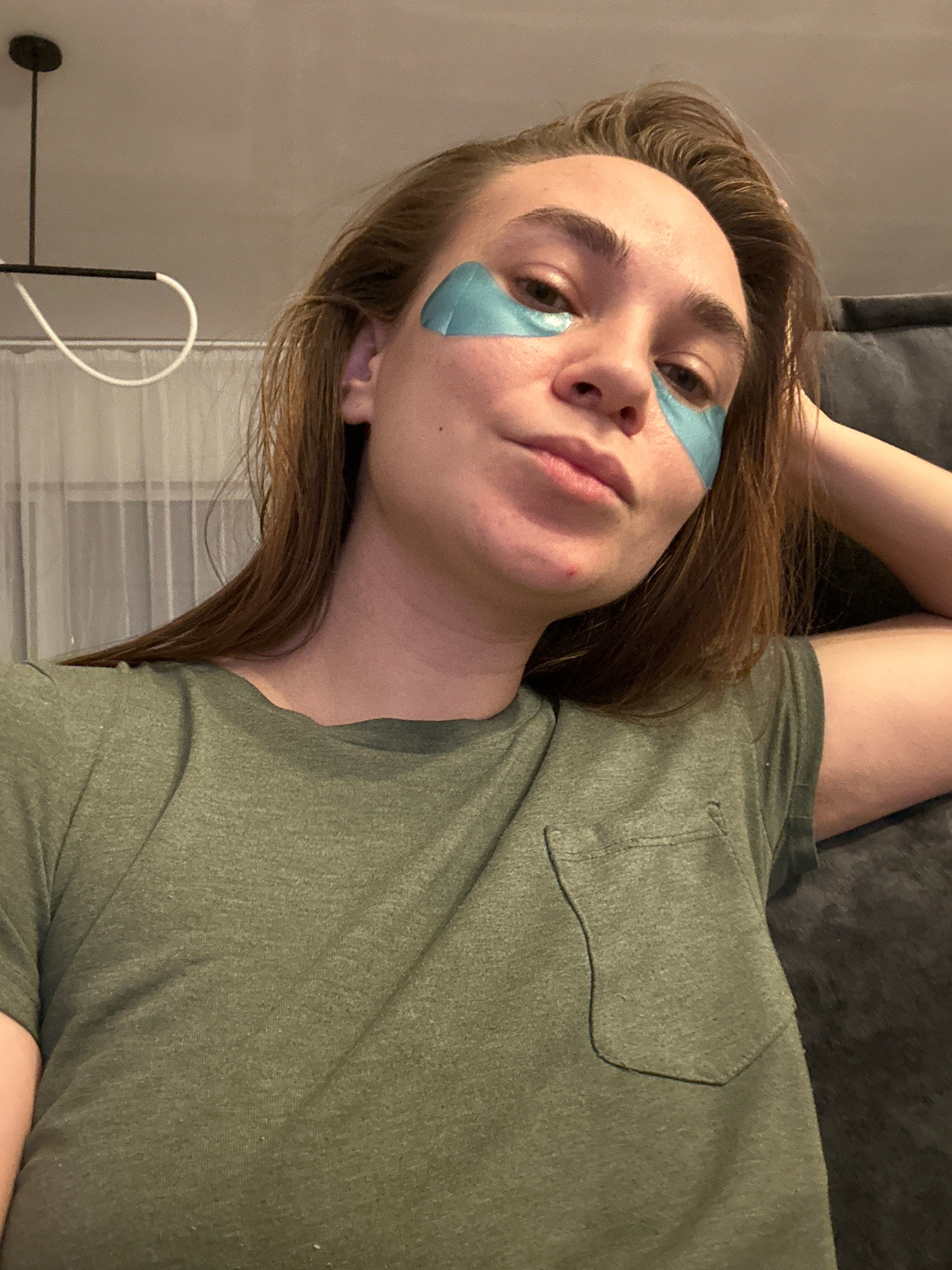 A woman lies on a gray surface, likely a couch or bed, wearing blue under-eye patches. She is wearing a green t-shirt with a pocket. Her hair is brown. In the background, there is a white cord and wha…read more