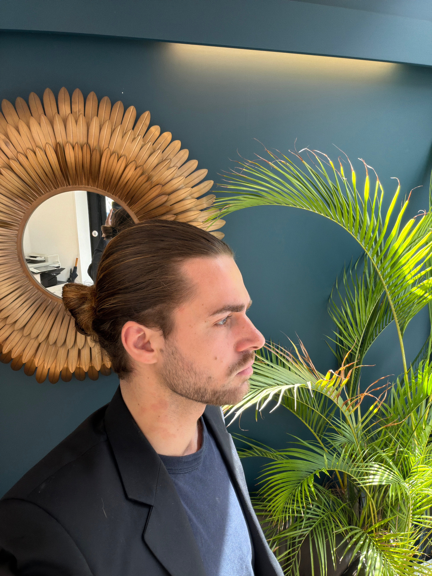 The media file displays an indoor scene, rotated 90 degrees counter-clockwise. The central subject is a man, viewed from the right side in profile, looking upwards. He has brown hair styled in a bun,…read more