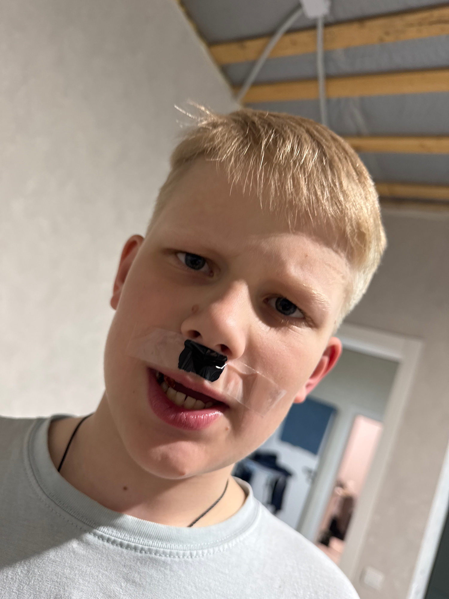 A close-up, angled shot of a young boy with blond hair, light skin, and light eyes. He is wearing a white t-shirt and a thin, dark necklace. Clear tape is attached to his face, spanning from above his…read more