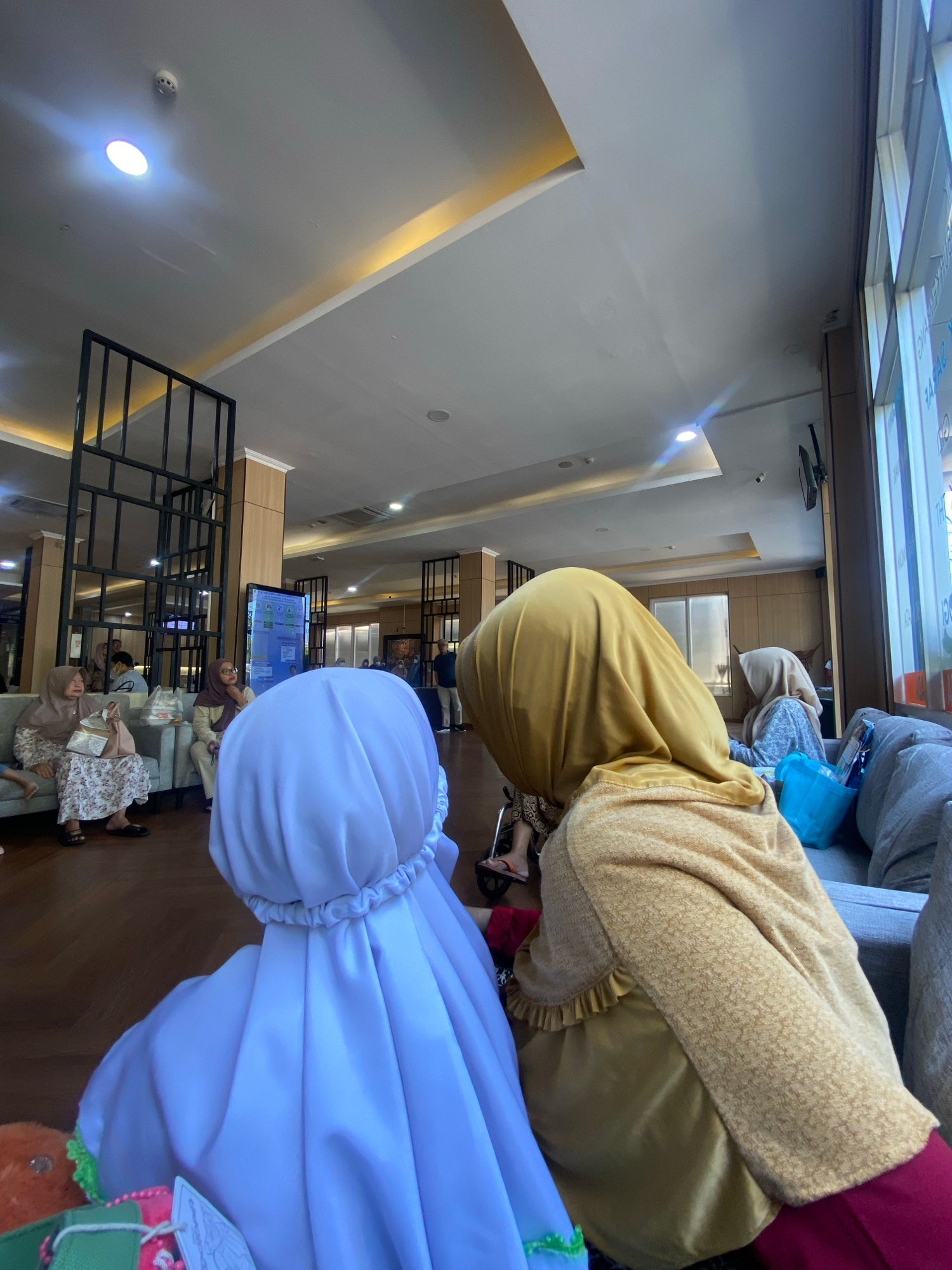 In an indoor waiting area, potentially a hospital or clinic in Sidoarjo, Indonesia, a group of people are seated on benches and chairs. Two women wearing hijabs, one in white and the other in yellow,…read more