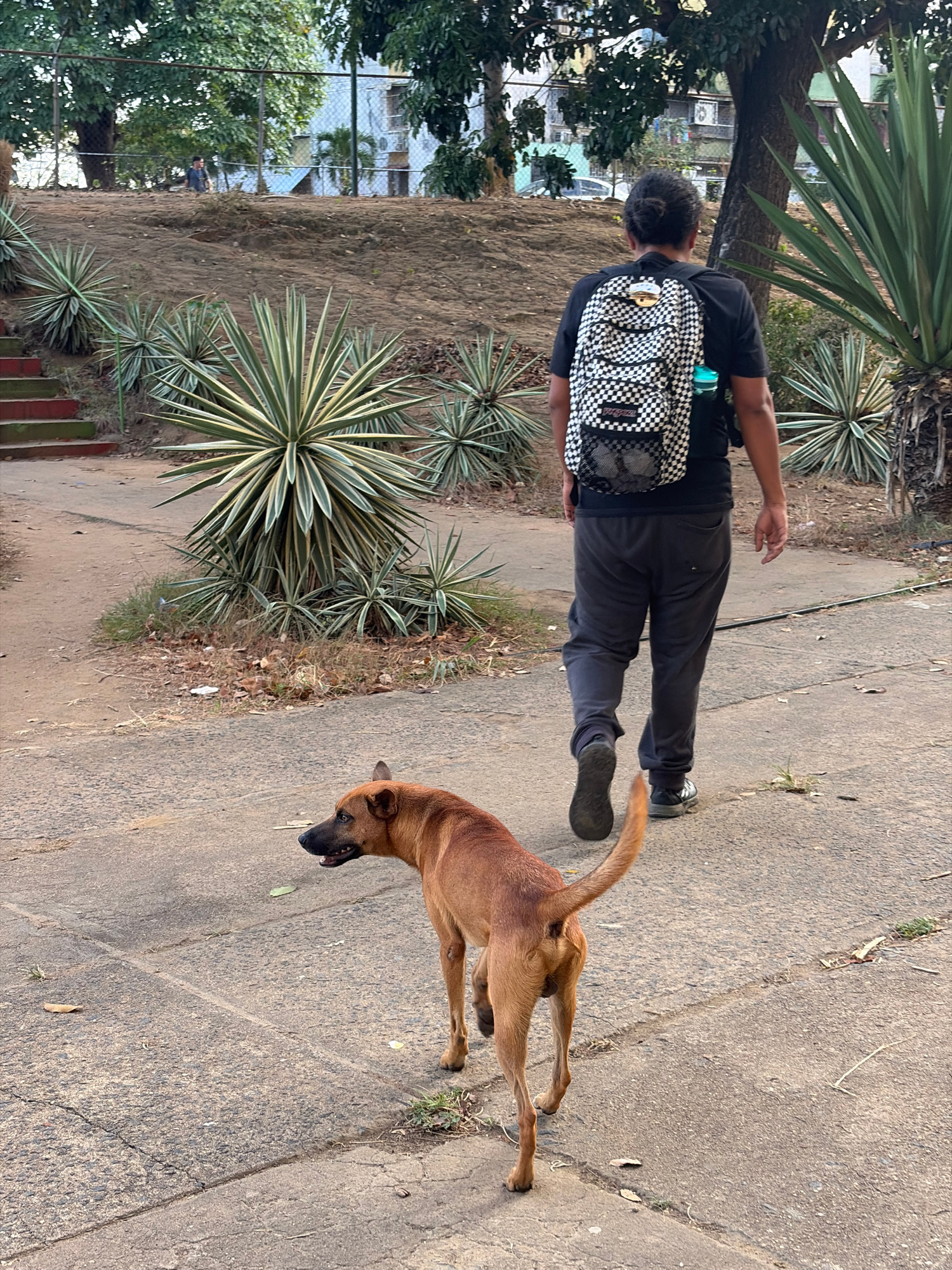 The image displays an outdoor scene in Ciudad Guayana, Venezuela, centered on a concrete pathway. An individual is observed from behind, walking away from the viewer. This person has dark hair styled…read more