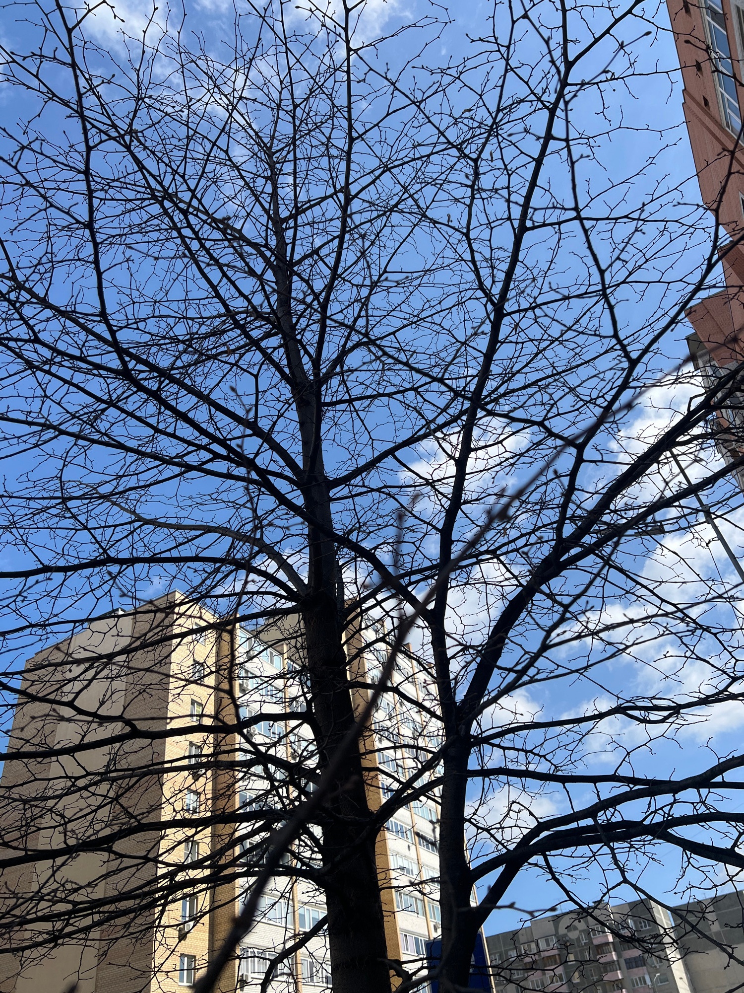 The image shows a low-angle view of bare tree branches against a blue sky with scattered clouds. Buildings are visible in the background: a brick building on the upper left and a taller, lighter-color…read more