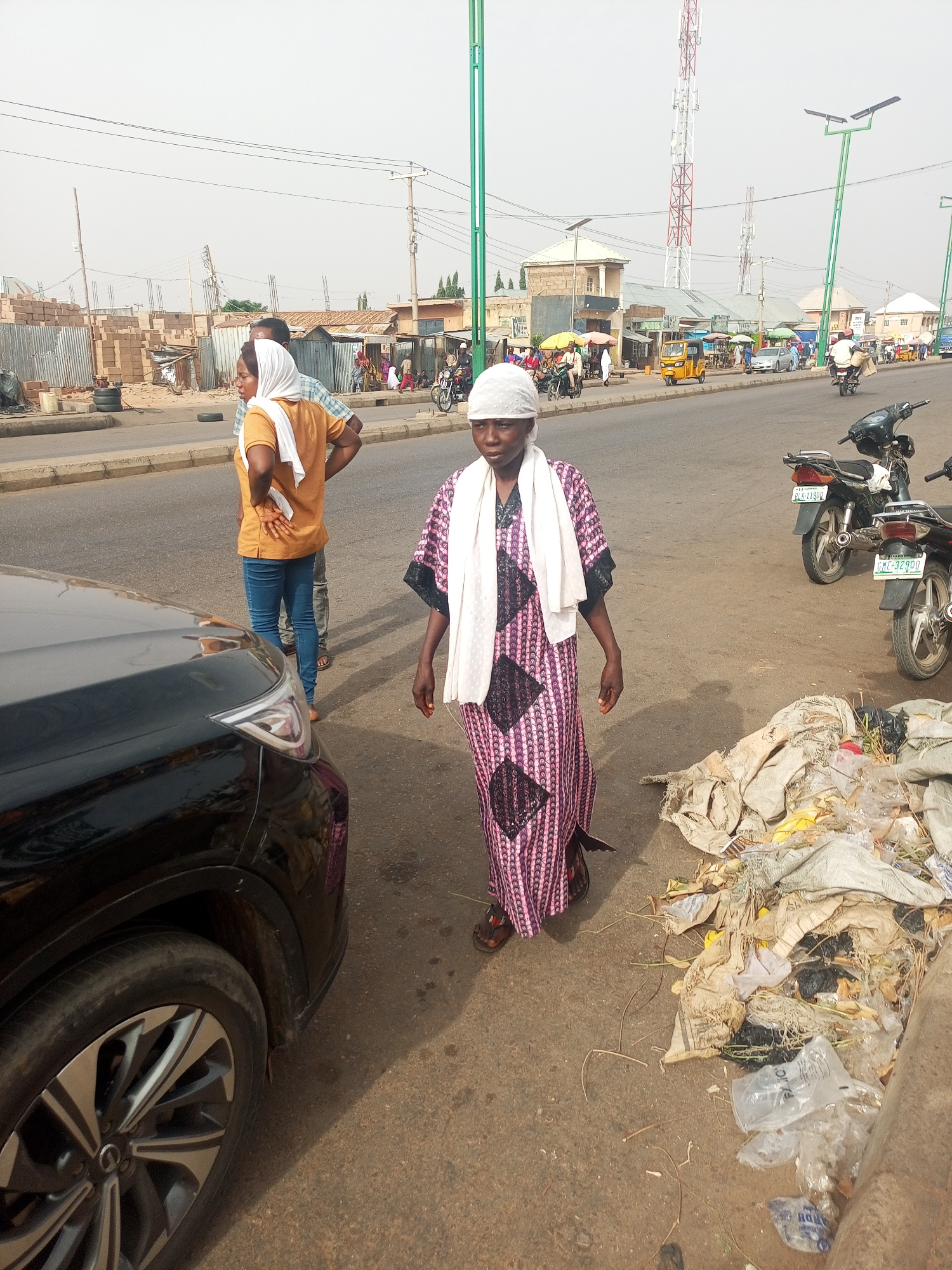 The image depicts a scene in what appears to be a bustling area of Tempure, Nigeria. A woman wearing a patterned, purple and pink dress and a white headscarf walks on the shoulder of a paved road. A w…read more