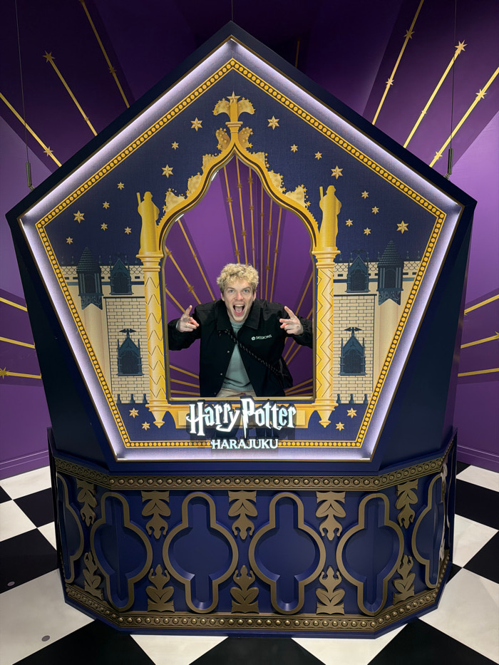 A young adult male with short, curly blonde hair poses enthusiastically within a large Harry Potter-themed display, located in the Harajuku district of Shibuya, Tokyo, Japan. The display is shaped lik…read more