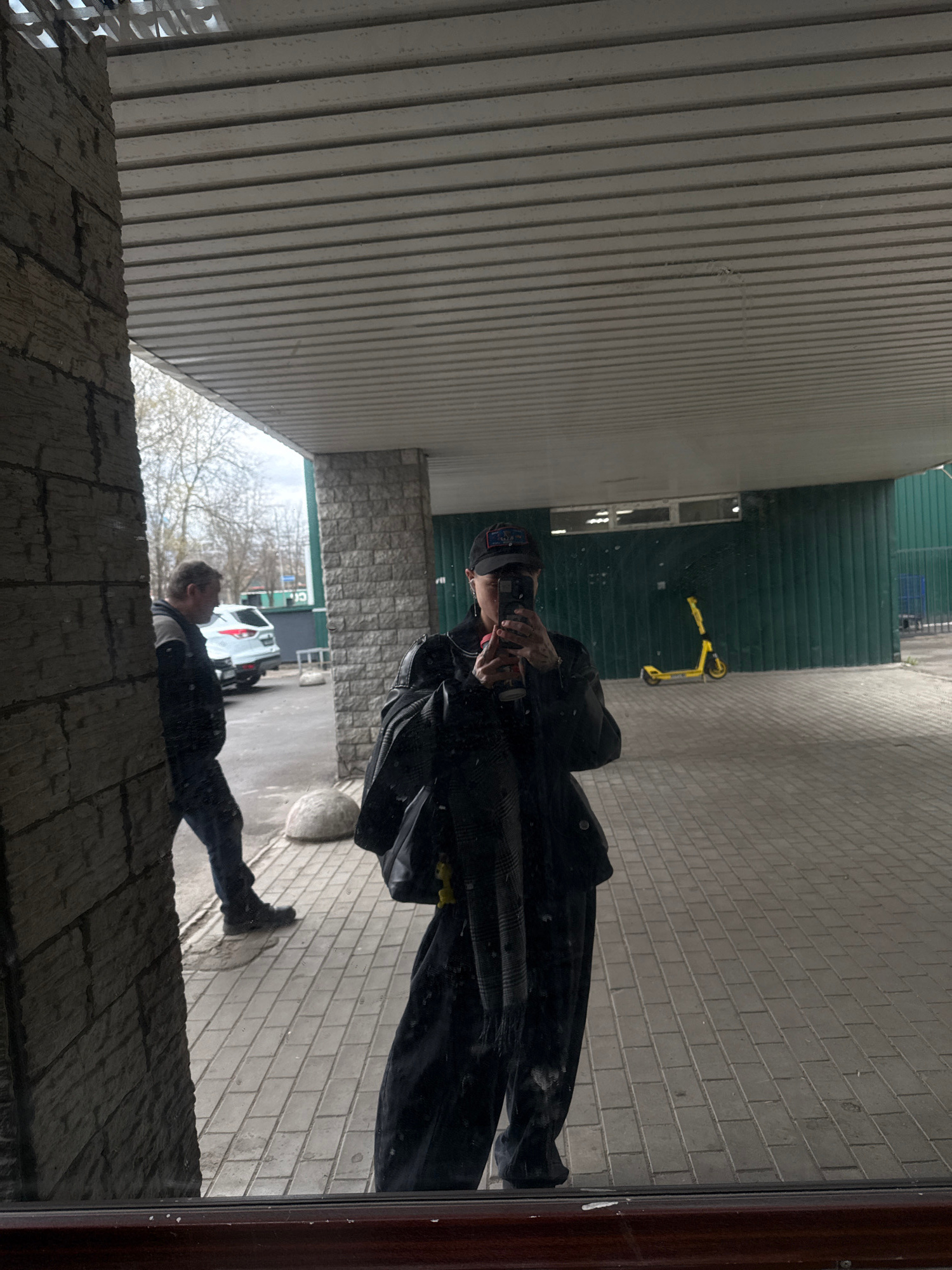 The image is taken from the inside, looking through a window towards an exterior setting, likely in Saint Petersburg, Russia. A person in dark clothing and a baseball cap is taking a selfie, holding a…read more