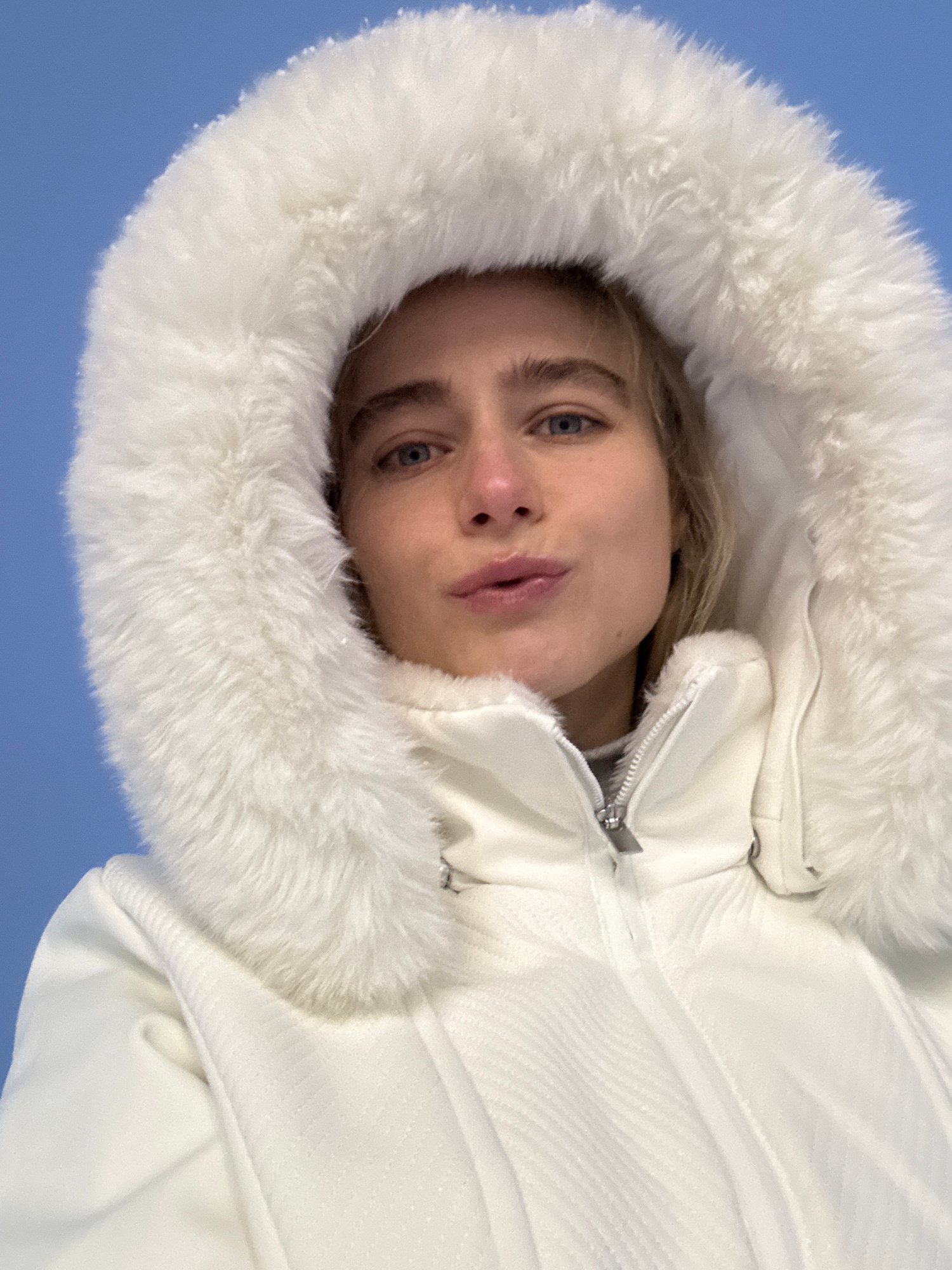A person with light skin and blue eyes, wearing a white puffy jacket with a fur-lined hood, is looking directly at the camera. The background is a solid blue, suggesting an outdoor setting, perhaps un…read more