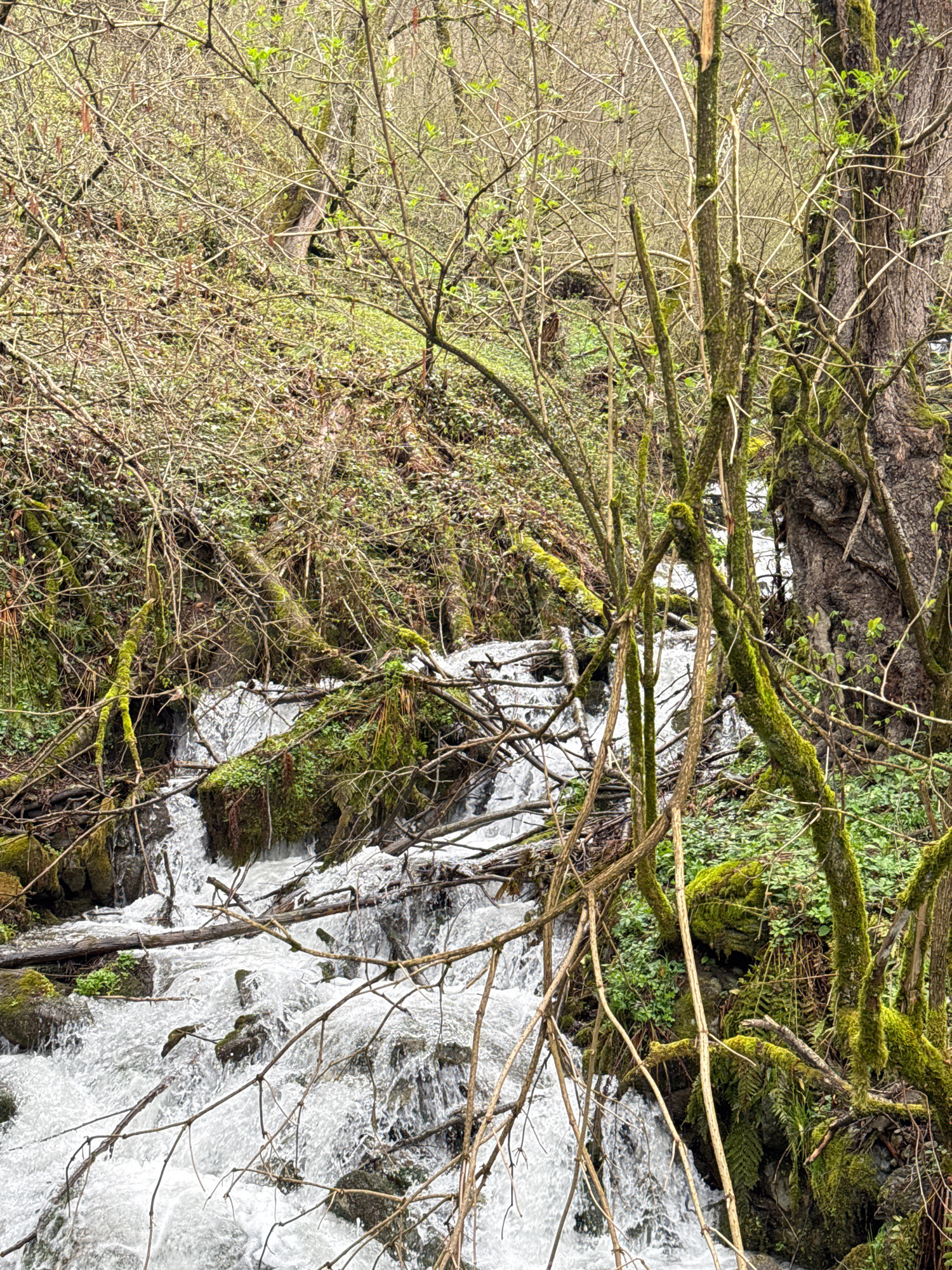 The image captures a waterfall cascading down a rocky slope in a forested area, with moss-covered branches and vegetation framing the scene. The water appears clear and fast-flowing, creating a dynami…read more
