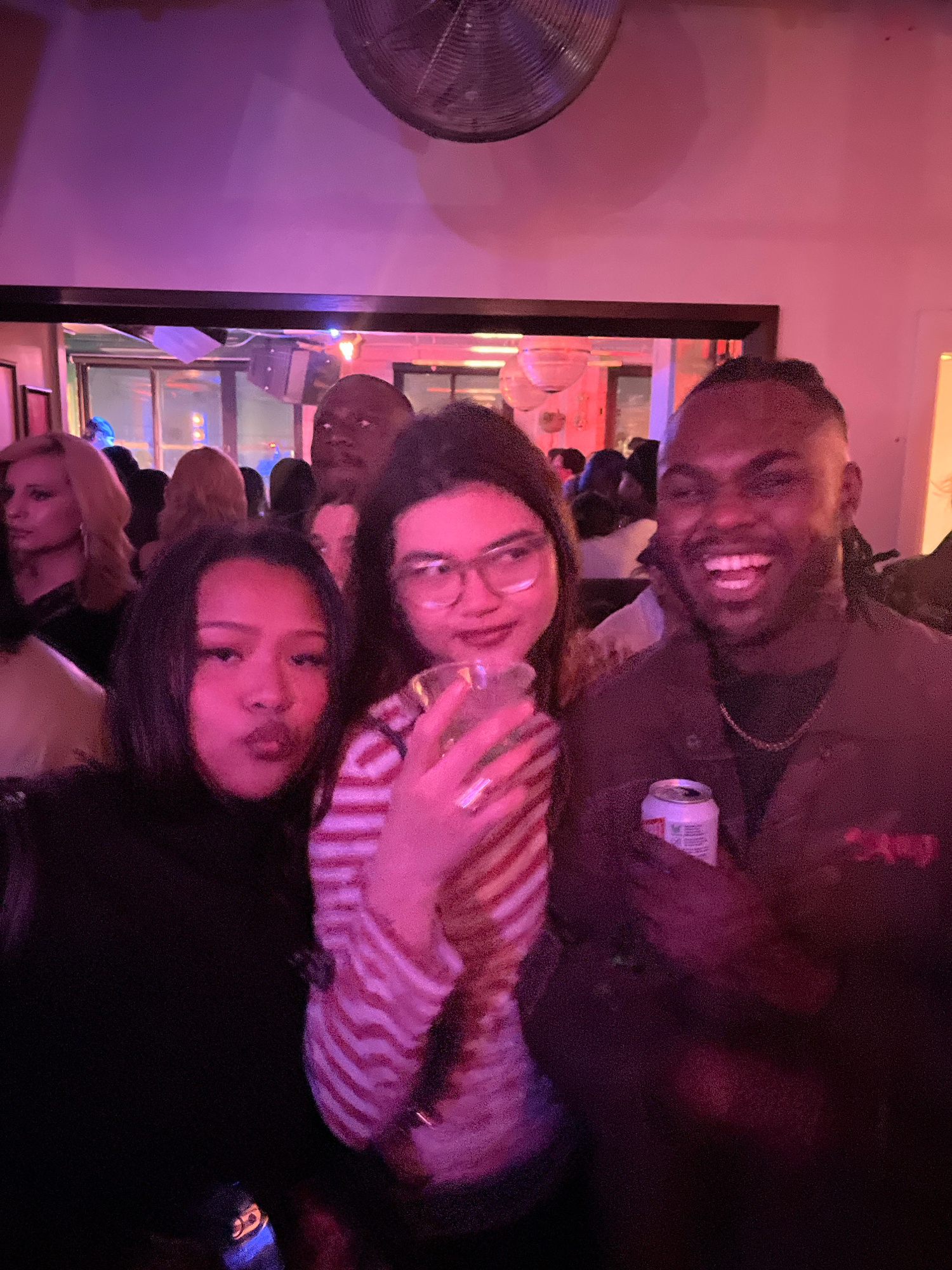This image captures a lively indoor social gathering, likely taking place at night in London, United Kingdom, given the dim, atmospheric lighting. Three individuals are prominently featured in the for…read more