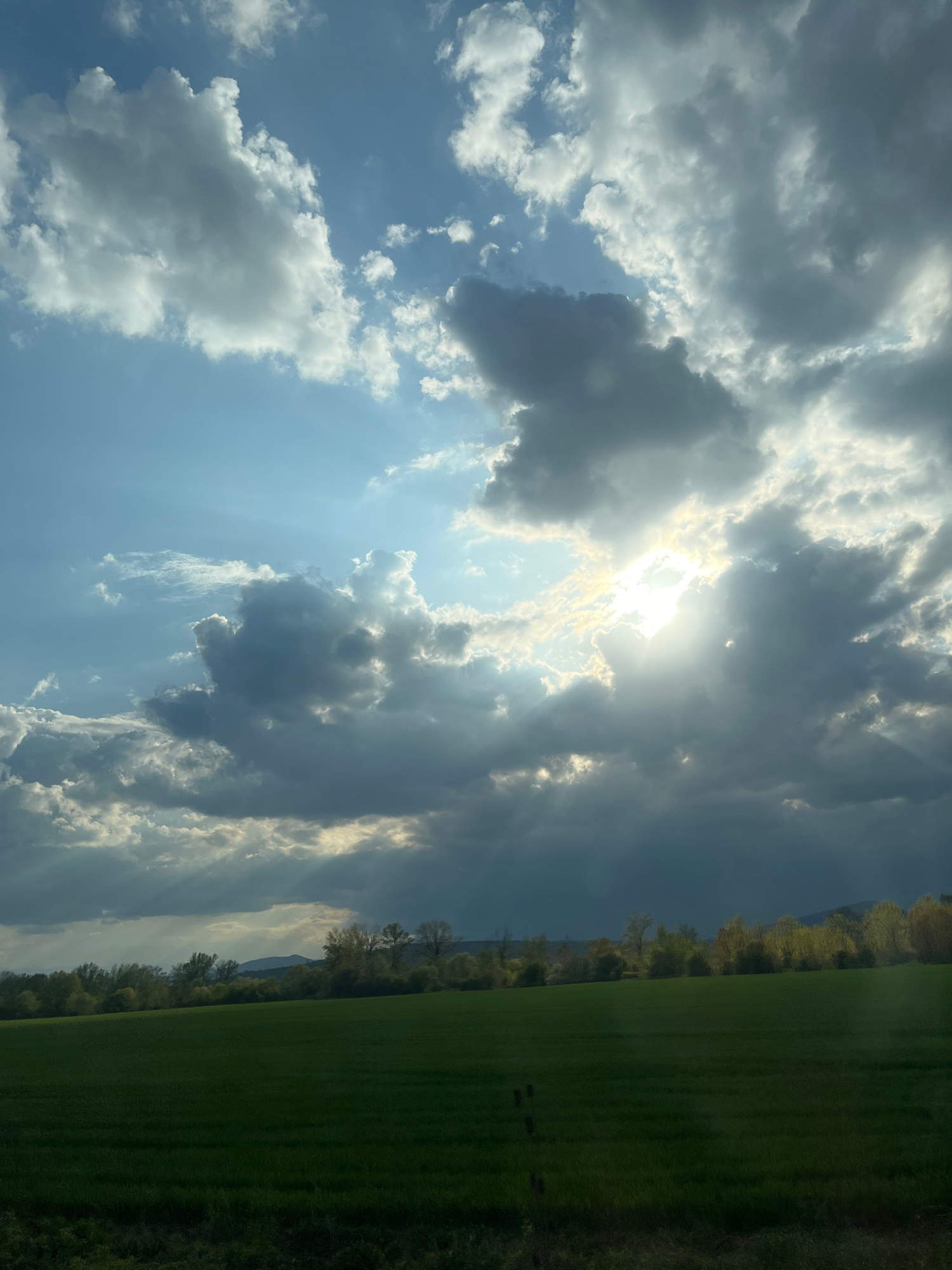 The image shows a landscape with a bright, cloud-filled sky occupying the left side and a green field on the right. The sun is visible through a break in the clouds, with rays of light streaming down.…read more