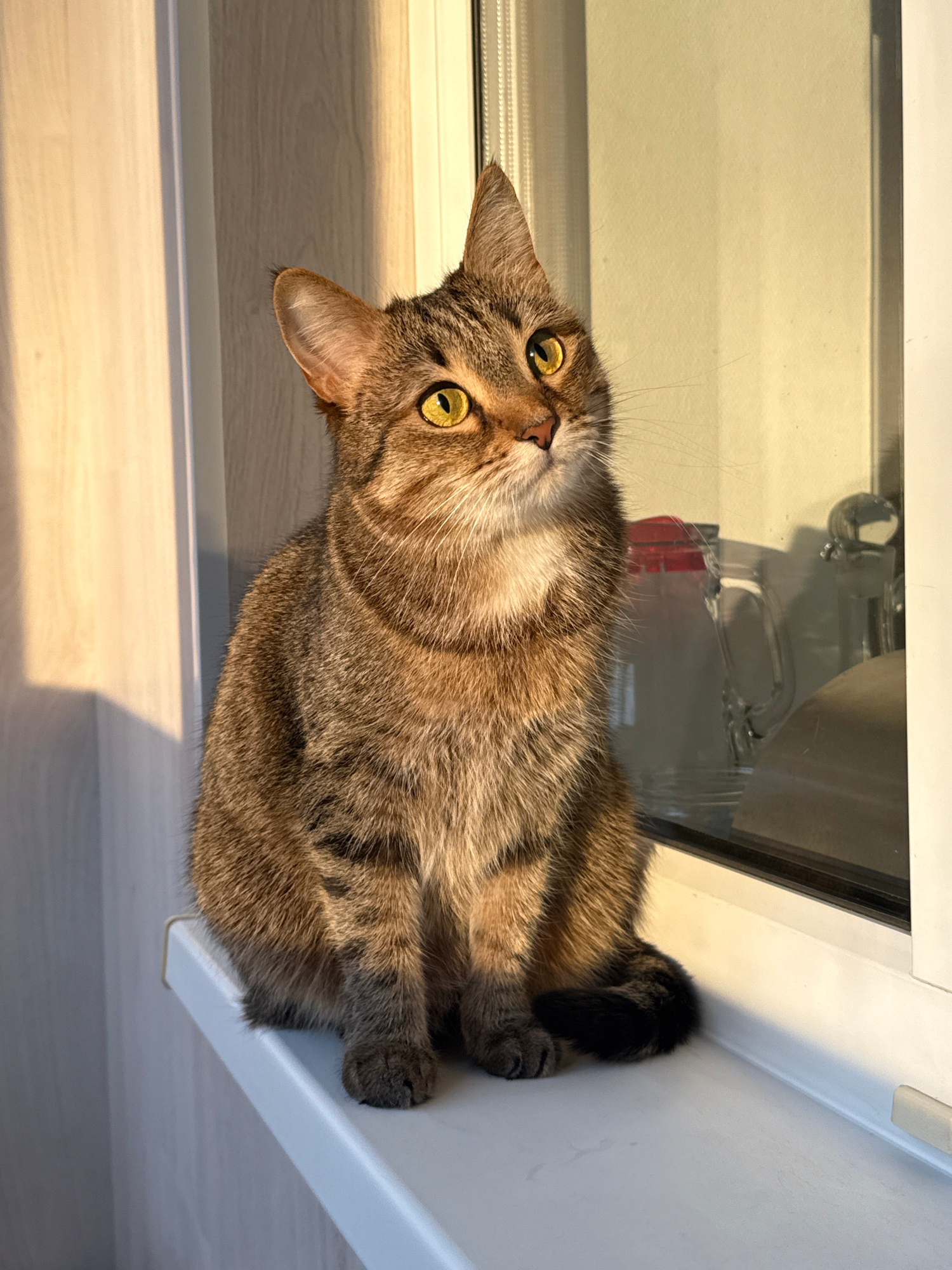 A brown tabby cat with yellow eyes is lying on a white windowsill. The cat is curled up with its tail tucked close to its body. The cat is looking up and to the left. The background includes a window…read more
