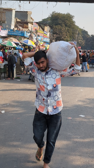 The image displays a young adult male carrying a large, light-colored sack over his right shoulder, supporting it with both hands behind his head. He is positioned centrally, looking directly at the cā¦read more