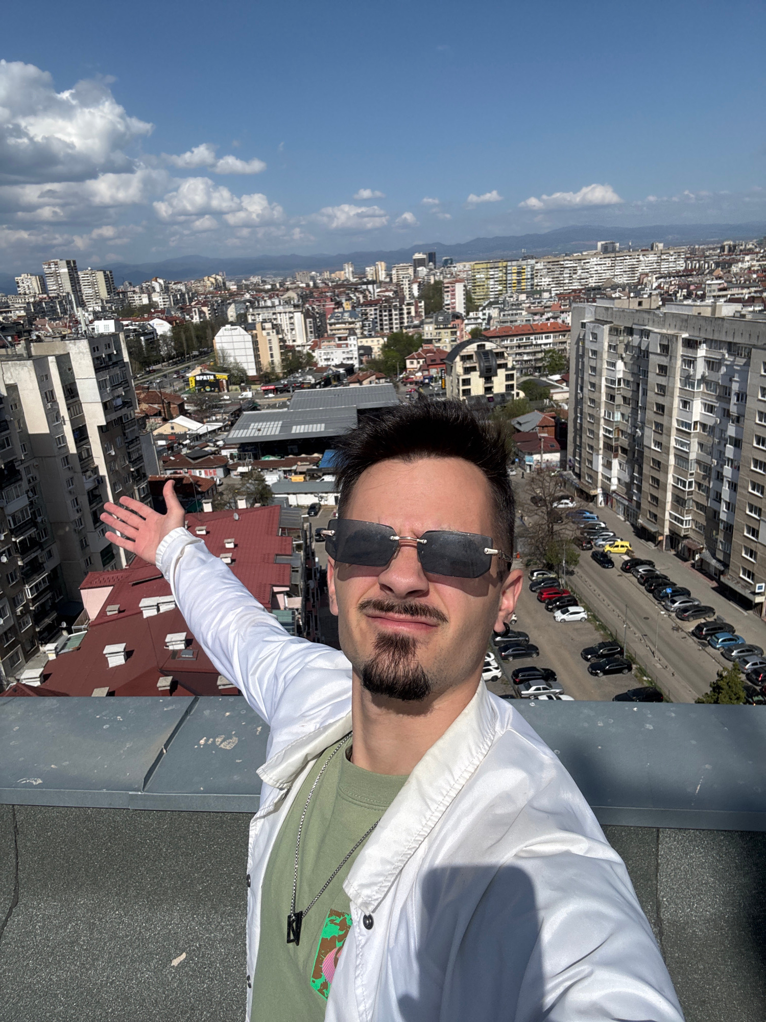 A man is captured in a selfie taken from a high vantage point, likely a rooftop, overlooking the cityscape of Sofia, Bulgaria, on a clear, sunny day. The man, positioned in the foreground and facing t…read more