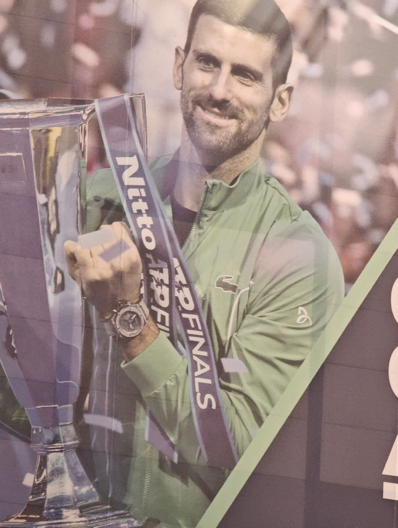 The image shows a photograph of Novak Djokovic holding a trophy. He is wearing a green jacket. The ribbon on the trophy reads "Nitto ATP Finals." There is a crowd in the background, partially obscured by confetti. The photograph is likely a poster or print and part of a larger display, as seen by the framing elements on the right. There is no indication of the location being Grocka Urban Municipality, Serbia. | Open Wire