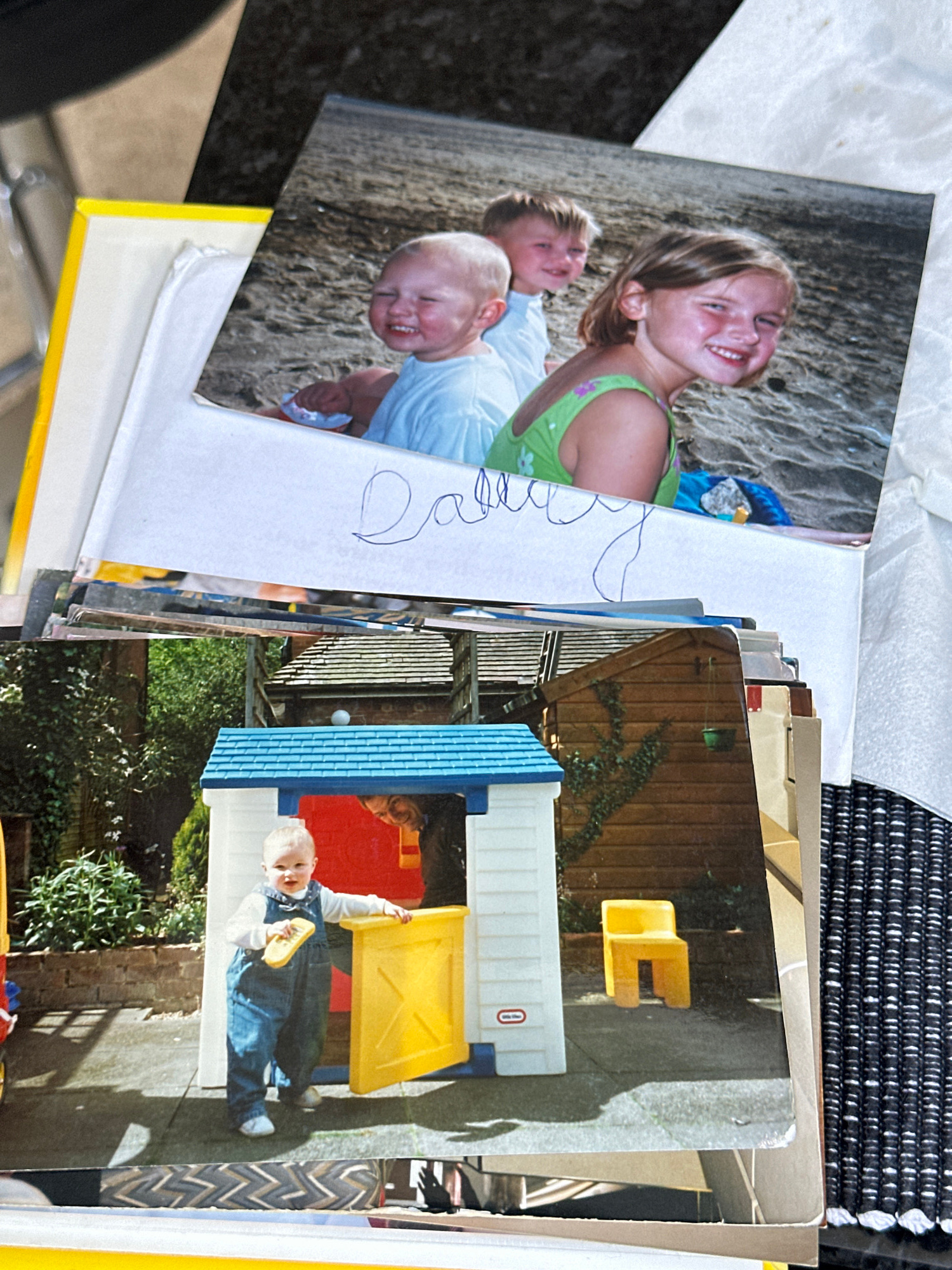 A stack of photographs is visible, displaying childhood images. The topmost photograph depicts three children on a sandy beach, with a girl in a green floral top smiling at the camera. Beneath her, tw…read more