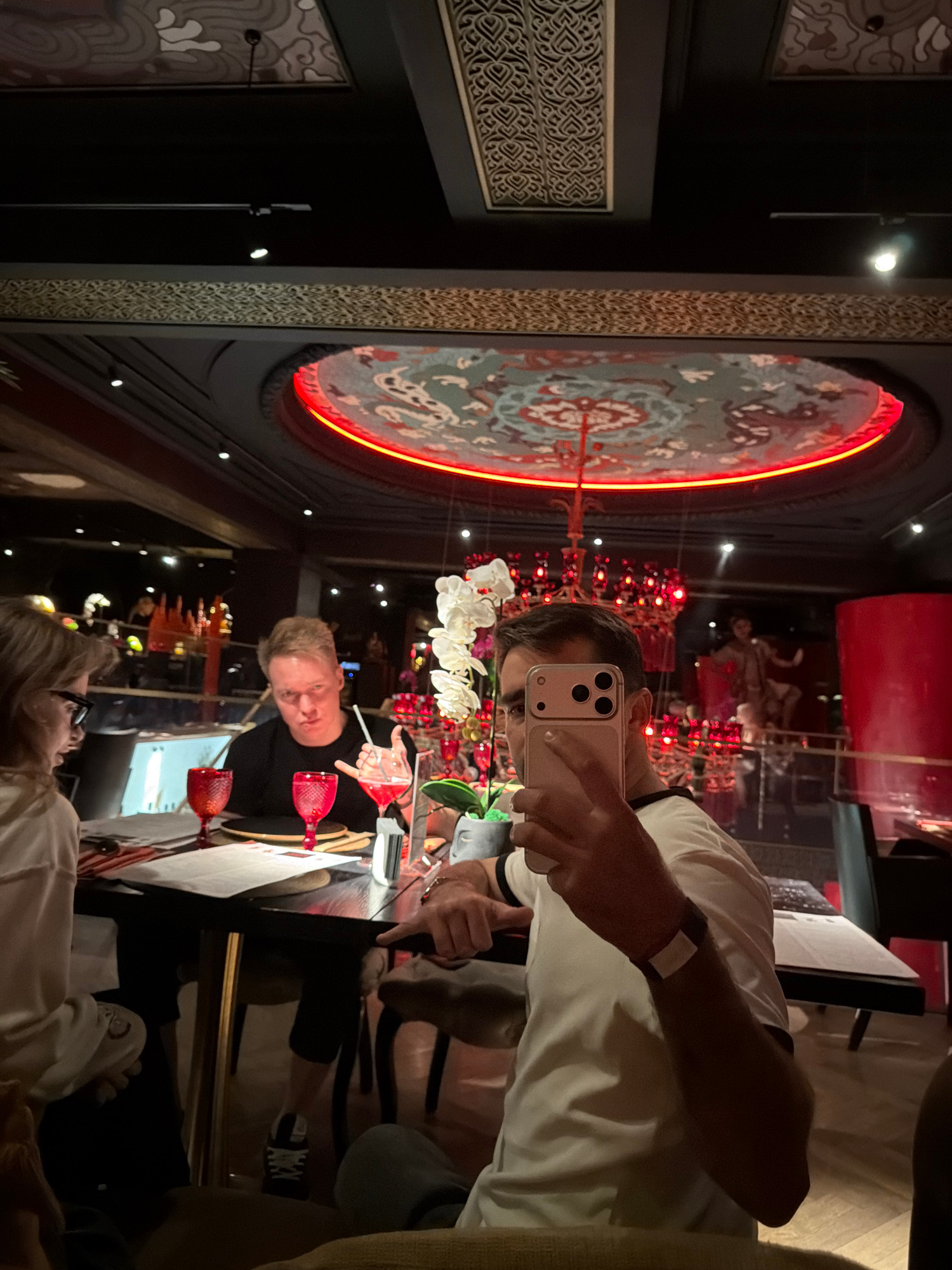 The image captures an interior scene in what appears to be an upscale restaurant or lounge, possibly located in Moscow, Russia, given the ornate decor. A large, circular, decorative panel with an intrβ¦read more