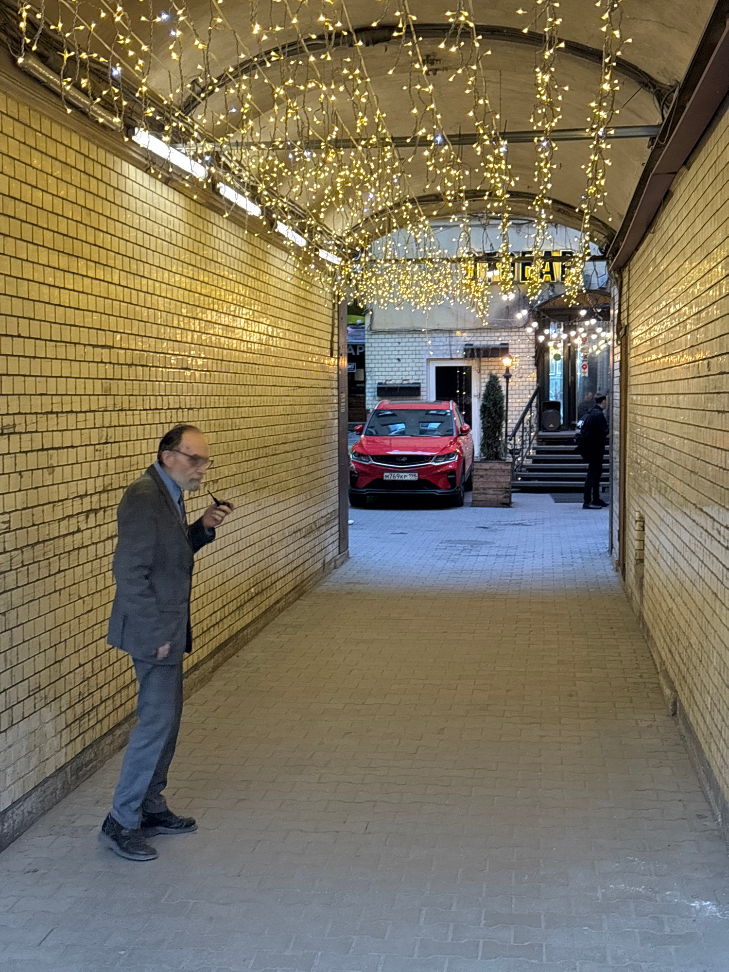 The image captures a man standing within a tunnel-like structure in Saint Petersburg, Russia. He is holding and smoking a pipe, wearing a gray suit and dark shoes, and is positioned against a wall til…read more