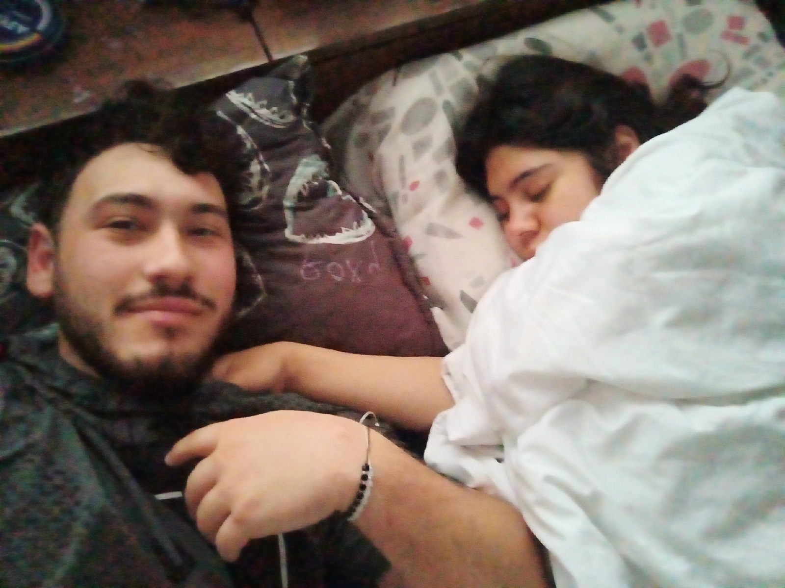 The image depicts a man and a woman lying in bed. The man is awake, looking at the camera with a slight smile. He has dark hair, a beard, and is wearing a dark patterned shirt. His left hand is visibl…read more