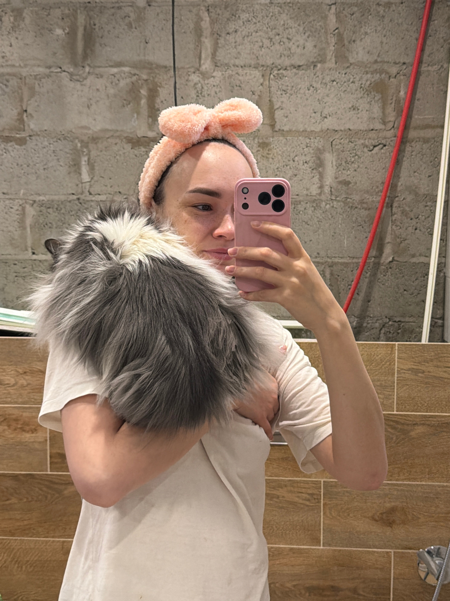 A person with a pink bunny ear headband is holding a gray and white cat while taking a selfie with a pink phone. The background includes a brick wall and tiled wall with a shower head. The location isβ¦read more