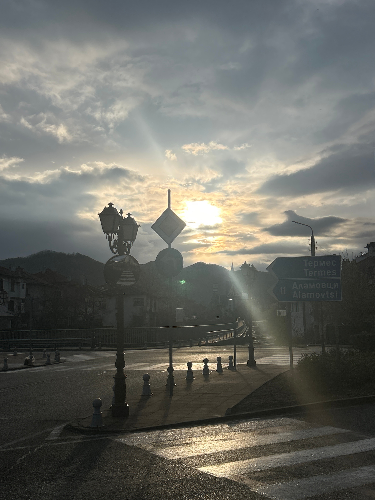 The image shows a street scene in Zlatograd, Bulgaria. The sky is filled with dramatic clouds, with the sun peeking through, casting rays of light. Street signs indicate "Termes" and "Alamovtsi" (11km…read more