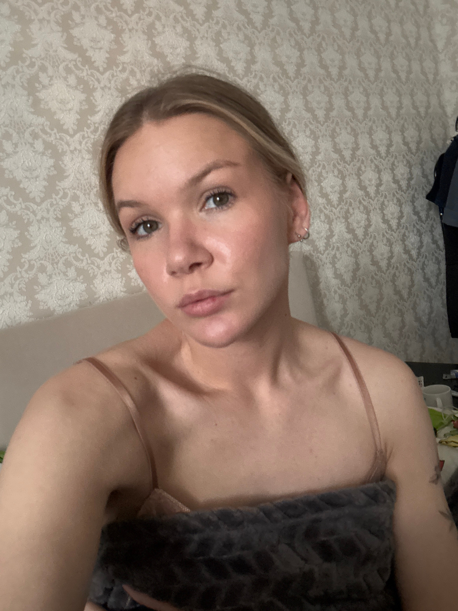 A woman is lying on a bed covered with a white patterned bedspread. She is partially covered with a gray blanket that has a textured pattern. She has fair skin, light brown hair, and is wearing a top…read more