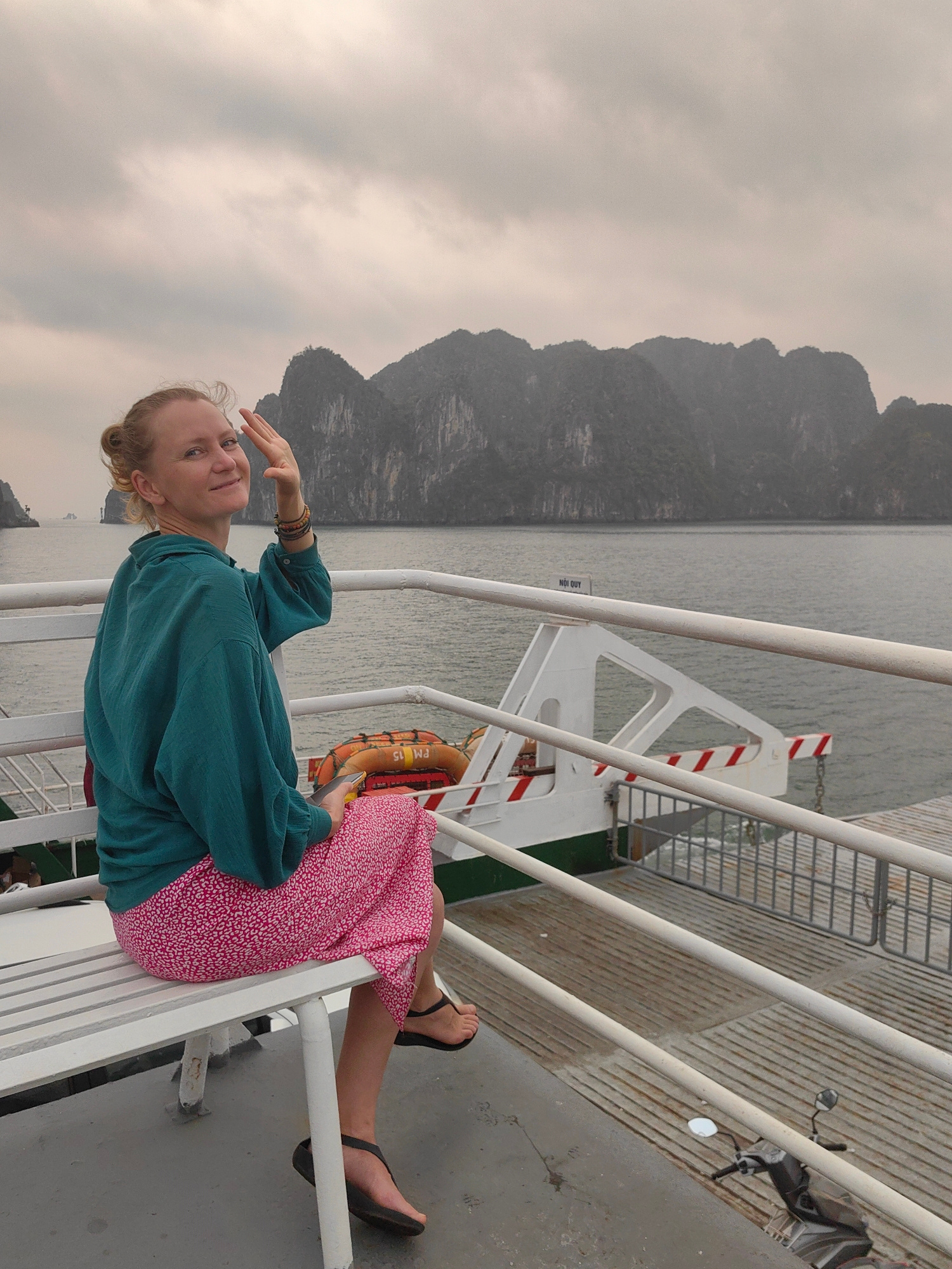 A medium shot depicts a blonde woman seated on a white bench on a ferry. The ferry appears to be in Tuan Chau Ward, Vietnam, given the landscape of limestone karsts in the background. The woman is wea…read more