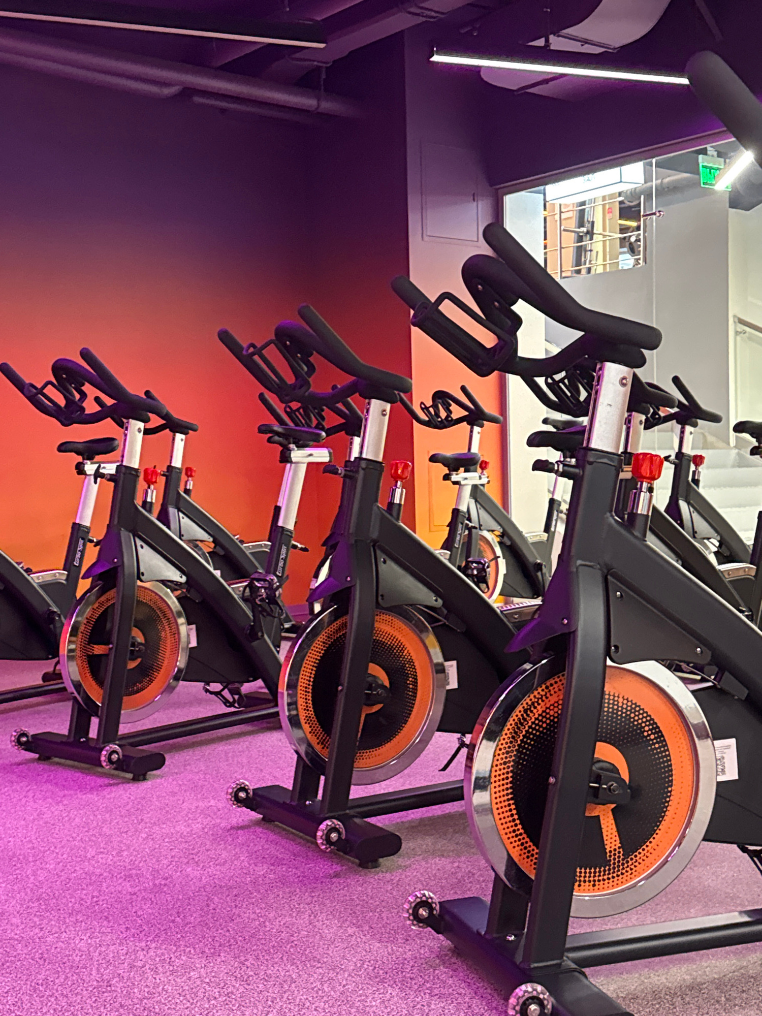 The image shows a row of spin bikes in a gym. The bikes are black with orange detailing on the flywheel. The gym has a color-gradient wall that fades from purple to orange. The floor is covered in a l…read more
