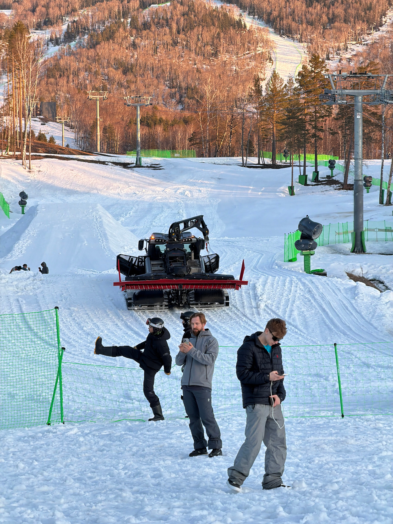The image depicts a winter scene, likely at a ski resort in Озёрное, Russia. A snow groomer, or snowcat, is positioned in the center of a snowy slope. Three individuals are present: one is looking at…read more