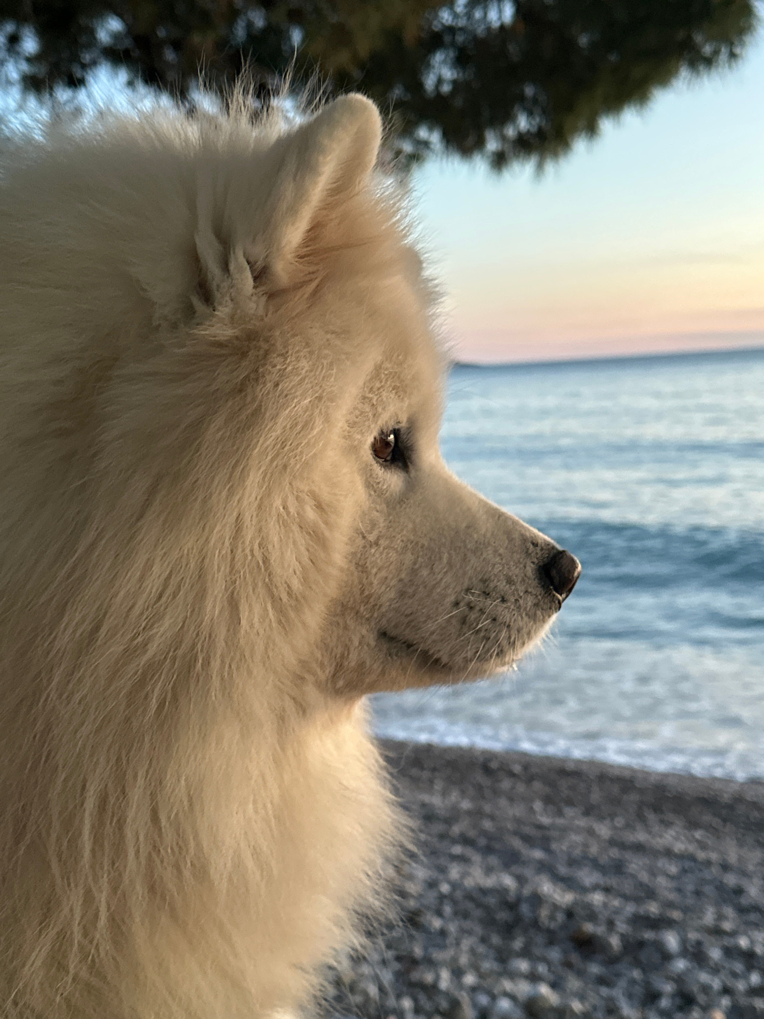A close-up shot depicts a white Samoyed dog looking upwards. The background is blurry, suggesting a beachside or coastal location. A dark green tree is visible on the left. A structure or barrier of g…read more