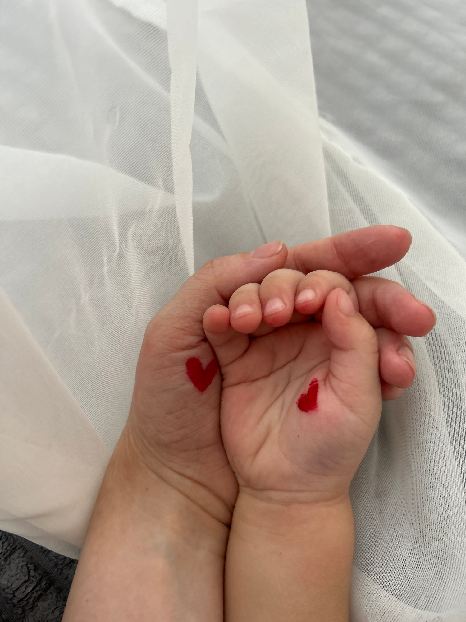 A close-up shot depicts an adult hand holding a child's hand, both resting on a white, semi-transparent fabric. Each hand has a red heart shape painted on the palm. The location is unknown, Ufa is not…read more