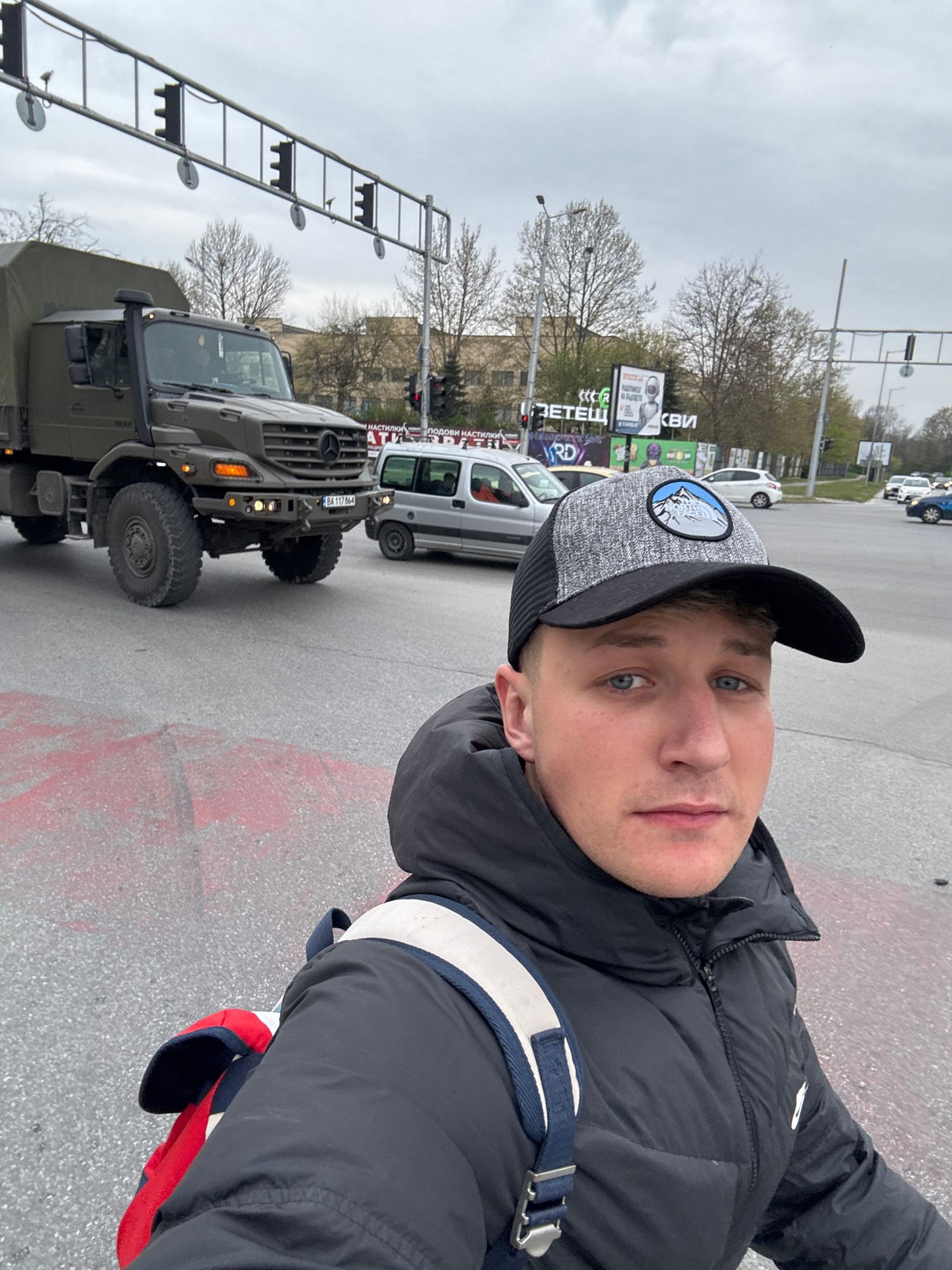 A man is taking a selfie on a street in Plovdiv, Bulgaria. The man is wearing a black jacket, a gray cap with a patch, and a shoulder bag with a blue and white strap. Behind him is a military vehicle,…read more