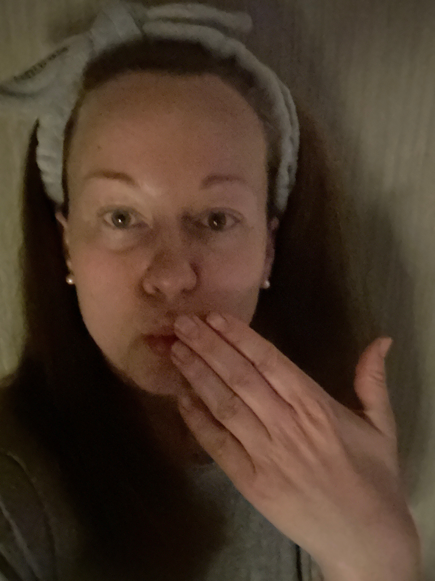 A woman lies on her back, wearing a grey headband and what appears to be a grey shirt. Her hand is positioned over her mouth and cheek. She has fair skin, light eyes, and pearl earrings. The backgroun…read more
