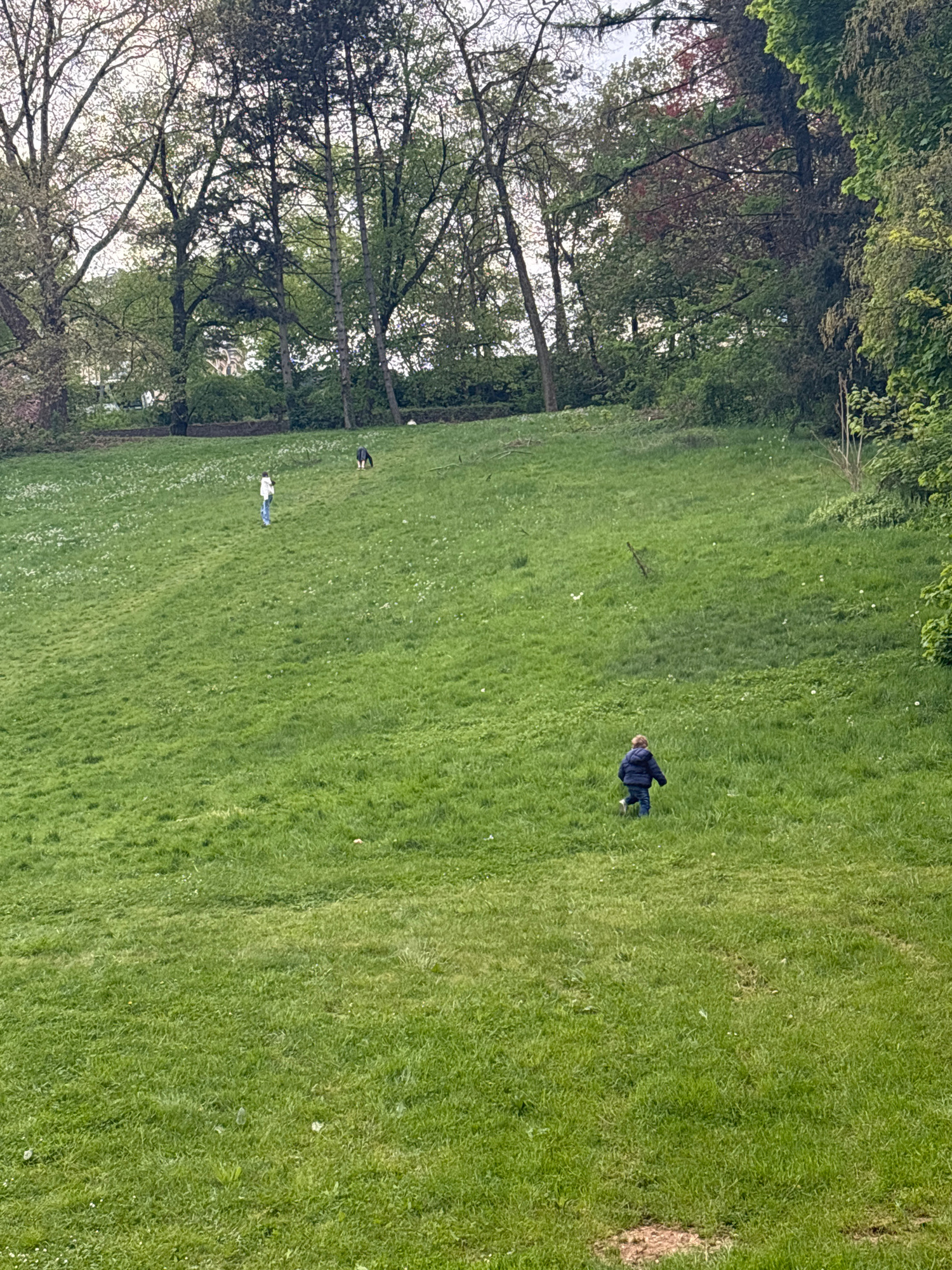 The scene is a grassy field, possibly a park, in Luxembourg City, Luxembourg, on an overcast day. The field is bordered by trees on the left side of the frame. There are three people visible in the fi…read more